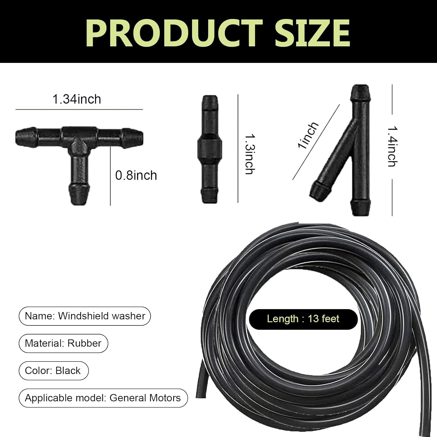 Package Contents: The package includes 1 x 13.1 foot windshield washer fluid hose and 30 hose connectors, including 10 Y-shaped, 10 I-shaped and 10 T-shaped connectors. Adequate quantity can meet your use needs, and there is no need to worry about the damage of the connector affecting the cleaning use of the wipers.
