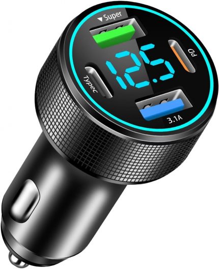 66W USB C Car Charger, 4 Ports Metal Mobile Car Charger with QC3.0 & PD30W Fast Charging, Fast Charging USB Cigarette Lighter Charger with LED Voltmeter for iPhone16 15 14 13 12, Samsung, iPad (Blue)