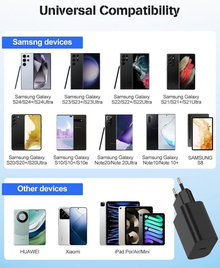 ⚡️【Widely Compatible】: Type c charger fast charging suitable for samsung galaxy s24/s24+/s24 ultra/s23/s23 plus/s23 ultra/s22/s22+/s22 ultra/s21 ultra/s21+/s21/s20 fe/s20/s20 ultra/s20+/S10/Note e20 ultra/note20/ note10/note10+/z fold 5/z fold 4/z fold 3/z flip 5/z flip 4/z flip 3/a52/a51/a42/a32/a22 and other type c devices.