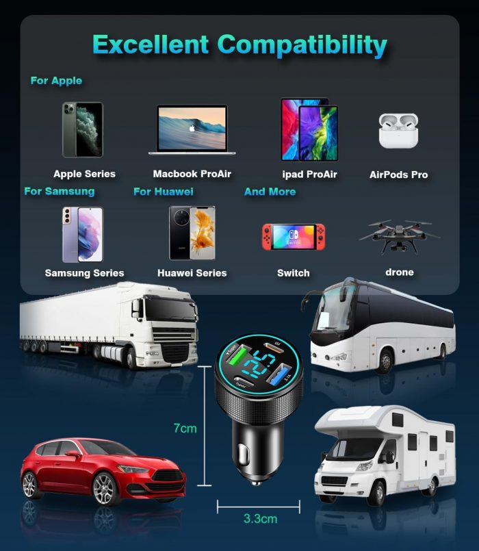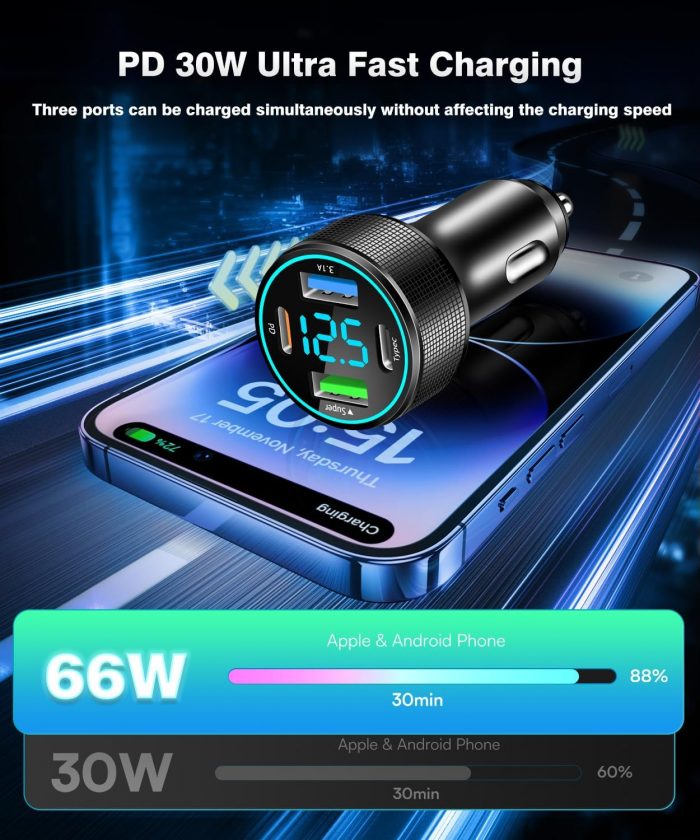 【66W QC3.0 & 30Q PD Super Fast Charging】 The output power of QC3.0 66W Max is six times faster than the 2.4A charger, and charges the mobile phone 0-85% in 30 minutes. The PD port supports 30w (maximum) output power, four times faster than traditional onboard 2.4 – A charger. When paired with PD fast charging cable, your mobile phone can charge more than 60% in 30 minutes. The four charging ports are independent of each other, allowing all four devices to charge simultaneously at the fastest speed.