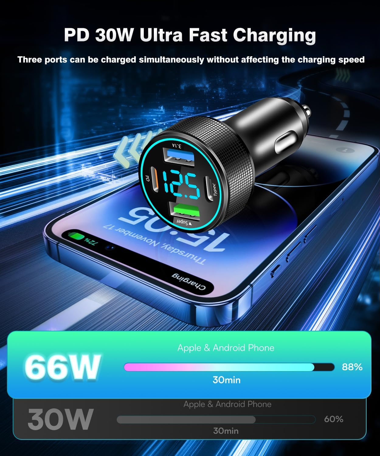 66W USB C Car Charger, 4 Ports Metal Mobile Car Charger with QC3.0 & PD30W Fast Charging, Fast Charging USB Cigarette Lighter Charger with LED Voltmeter for iPhone16 15 14 13 12, Samsung, iPad (Blue)