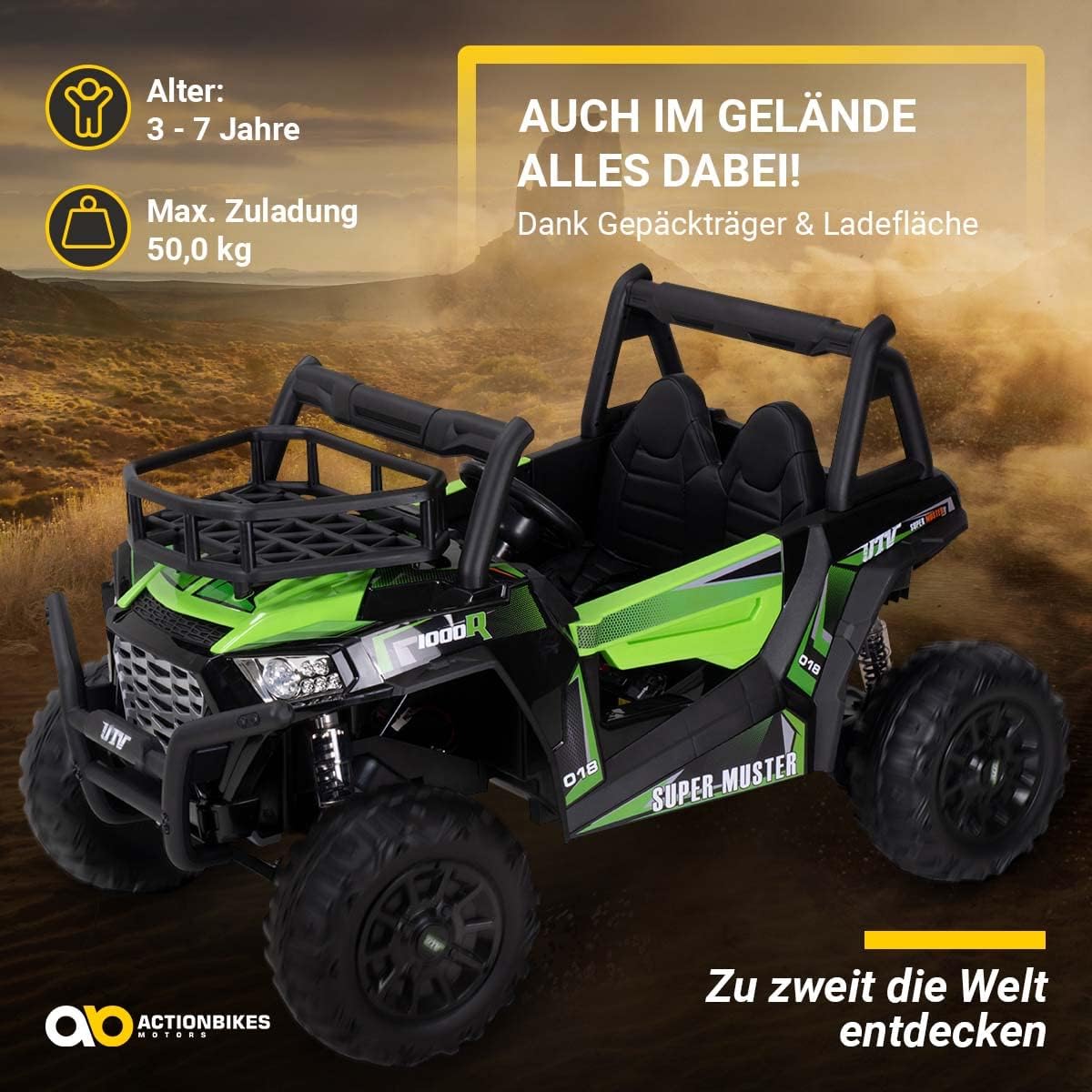 Be the first to review “Actionbikes Motors Jeep UTV Explorer Coche eléctrico para niños 2x200W Motor 2 plazas 2.4GHz Control remoto Neumáticos con anillo de goma suave Faros LED (Negro/Verde)” Cancel reply