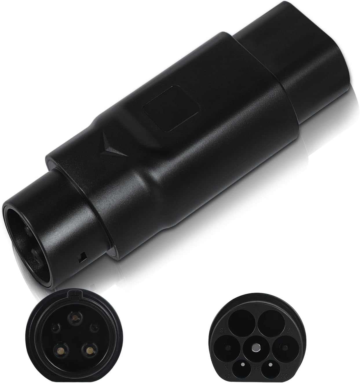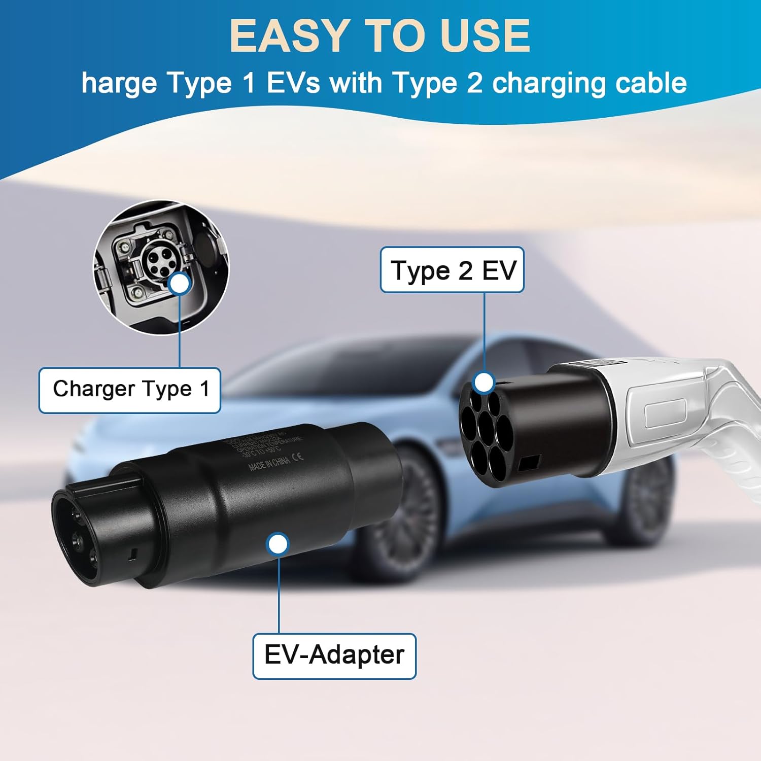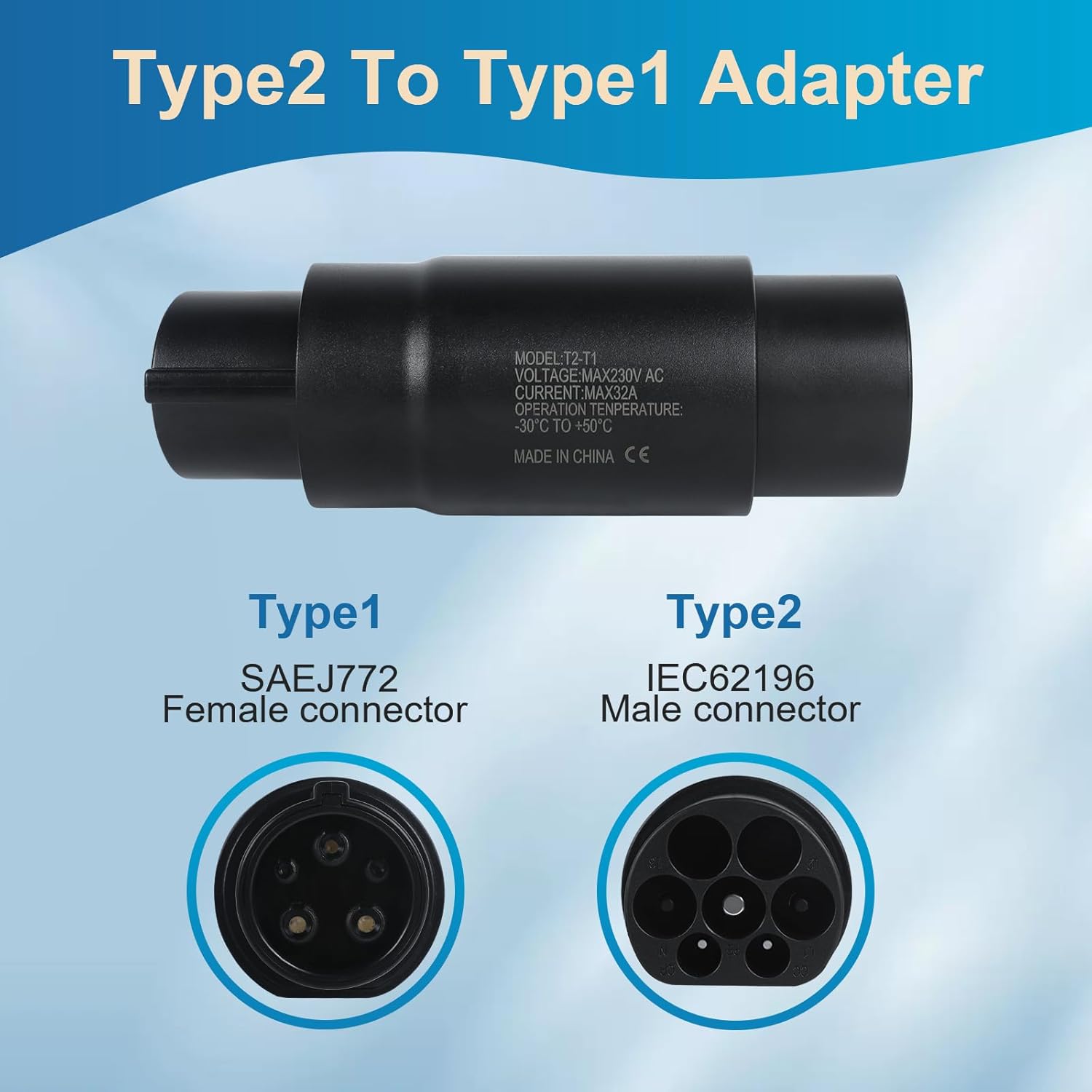 (Escenario de aplicación) – El adaptador tiene dos lados. Este adaptador EV se puede convertir fácilmente del Tipo 2 (IEC 62196) al Tipo 1 (SAE J1772). Se ajusta bien y no se cae fácilmente. Es compatible con una amplia gama de vehículos eléctricos Tipo 1. El adaptador supera las certificaciones de las normas de seguridad CE y TÜV y se puede utilizar sin dudarlo.