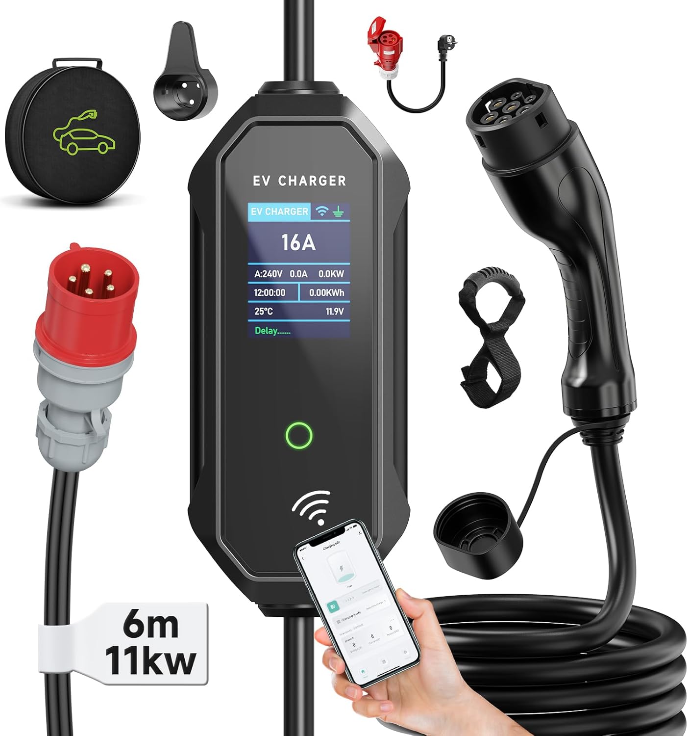 AFYEEV 6M Electric Car Charger 11kW, EV Charger Type 2, Chargers for Electric Vehicles, Adjustable Current 8A-16A, EEC 5Pins, IEC 62196-2, IP65