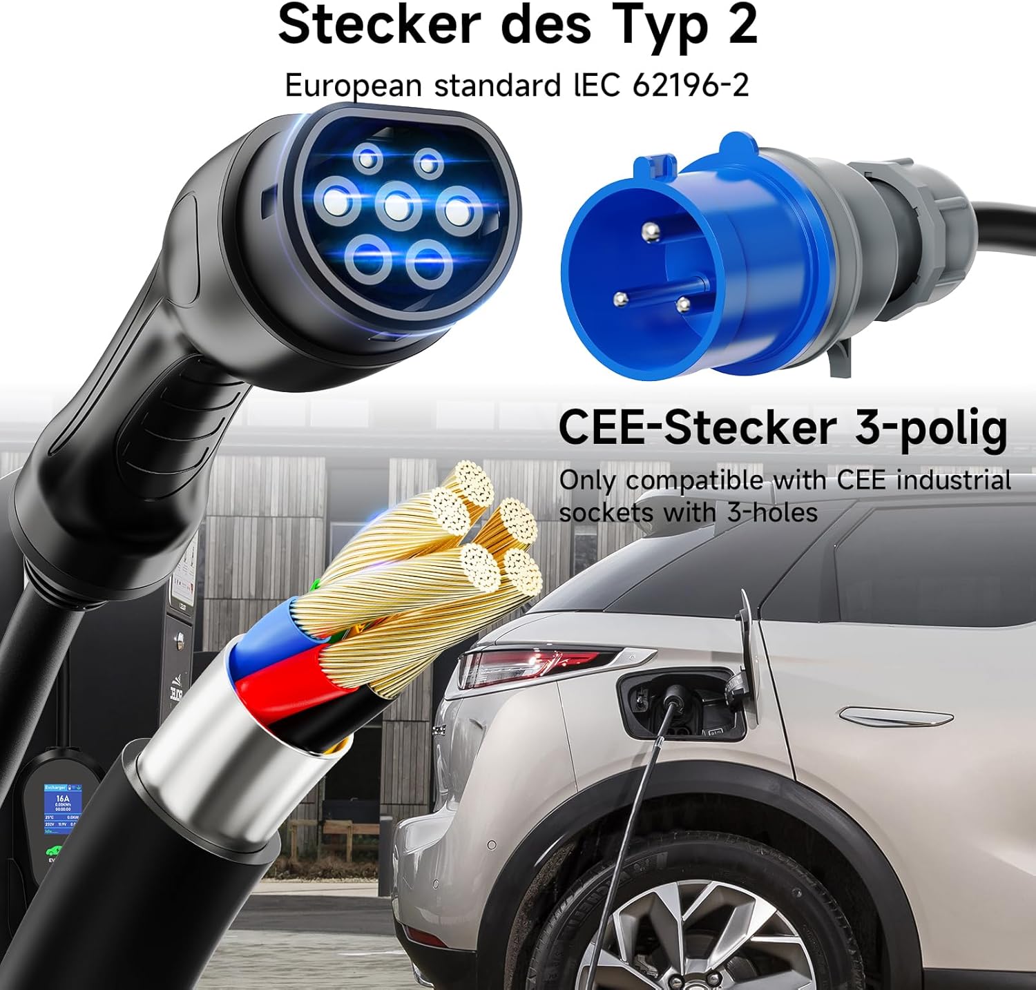 Alta compatibilidad El cable de carga para automóvil viene con un bolso que ocupa menos espacio durante el transporte. Puedes llevártelo a casa o viajar. Y este cable de carga Schuko tipo 2 es muy compatible y puede ser compatible con los vehículos eléctricos del modelo IEC 62196-2.