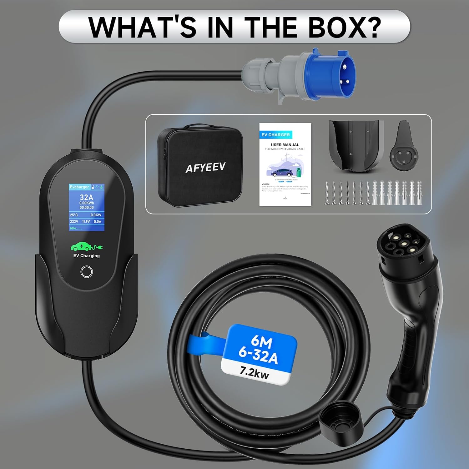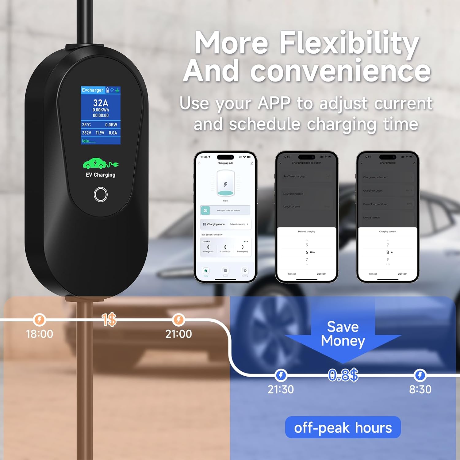 Fácil de usar: muchas funciones Este enchufe para automóvil eléctrico se puede cargar cuando está enchufado y tiene una función de ajuste de corriente, 6/8/10/13/16/20/24/32A, y el voltaje de entrada es de 200-240V. Este cargador de coche eléctrico puede alcanzar una potencia máxima de 7,2kg y 15 horas. La función de carga retrasada puede evitar cargas elevadas durante las horas pico.