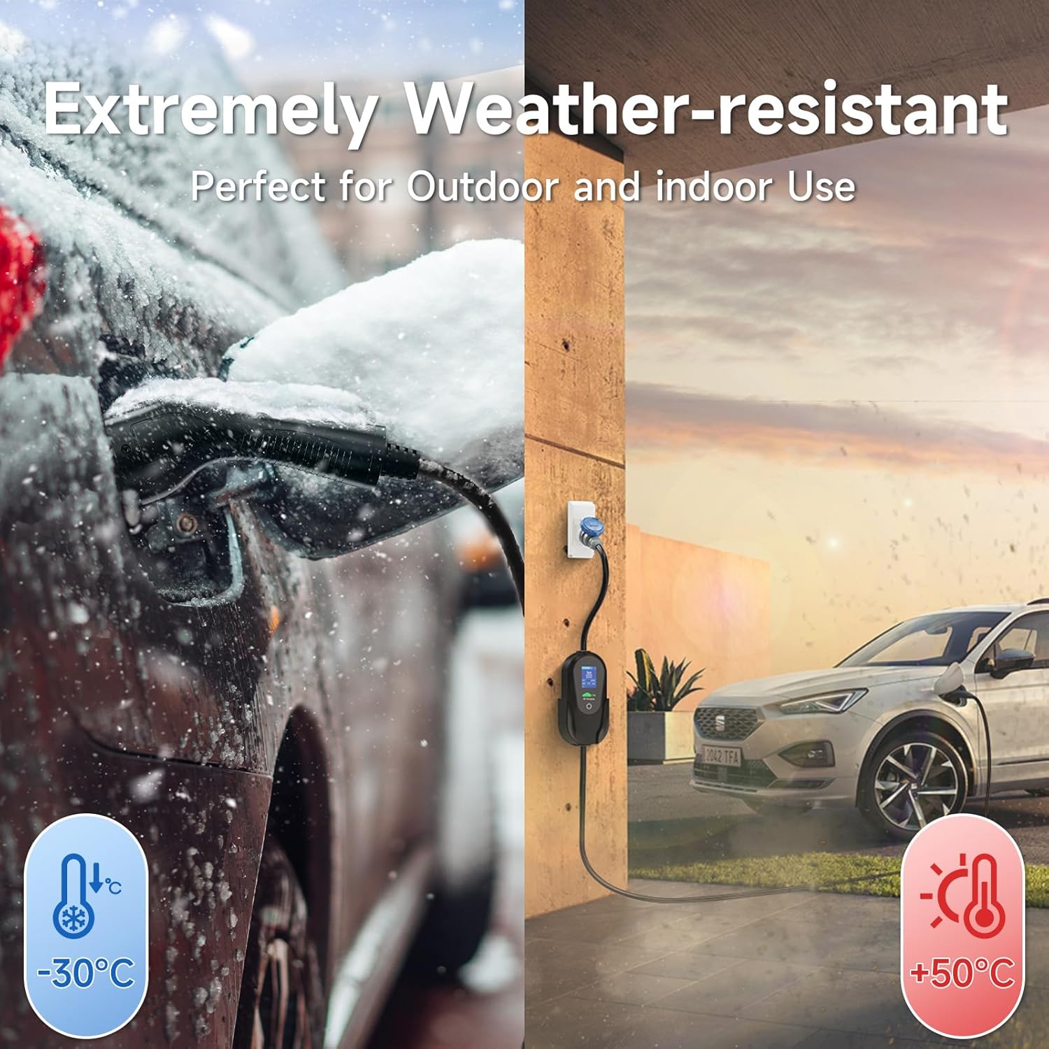 Protección de seguridad Este cable de carga para automóvil es resistente al agua y al polvo. Además, cuenta con protección contra fugas, cortocircuitos, sobrecalentamiento, conexión a tierra, sobrecorriente, bajo voltaje y sobrevoltaje.