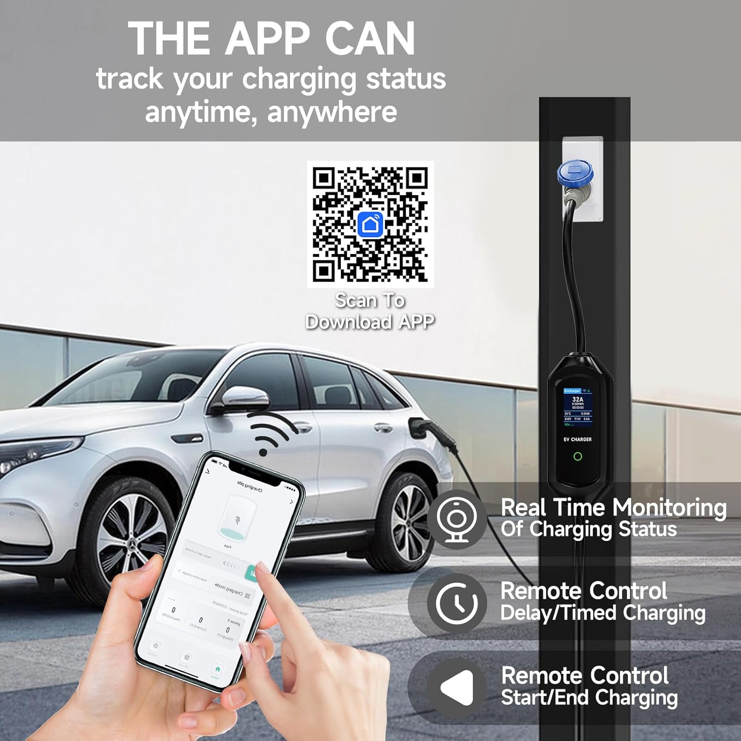 Modo de carga rápida La corriente ajustable de nuestro cargador EV es 6A/8A/10A/13A/16A/20A/24A/32A, y la potencia de salida es 7,2kW, que es más rápida que la de los cargadores tradicionales. Puedes elegir la corriente según la batería y el estado del vehículo. Nota: La corriente no se puede cambiar durante la carga.