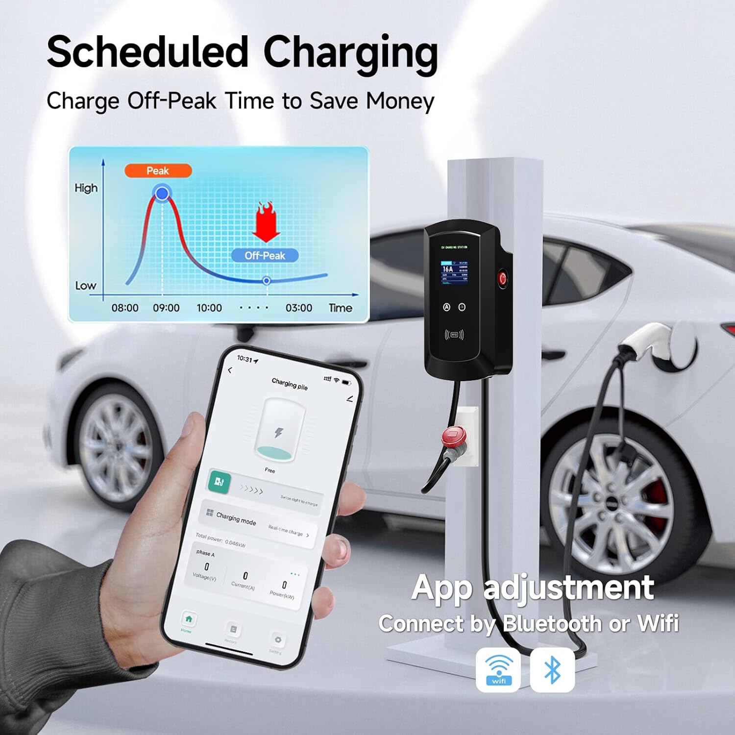 Control inteligente de APP: ya sea configurando el tiempo de carga, controlando la corriente (8A-16A), ajustando el estado de carga actual o ajustando el tiempo de carga retrasado. Puede controlar fácilmente la estación de carga a través de su teléfono inteligente.