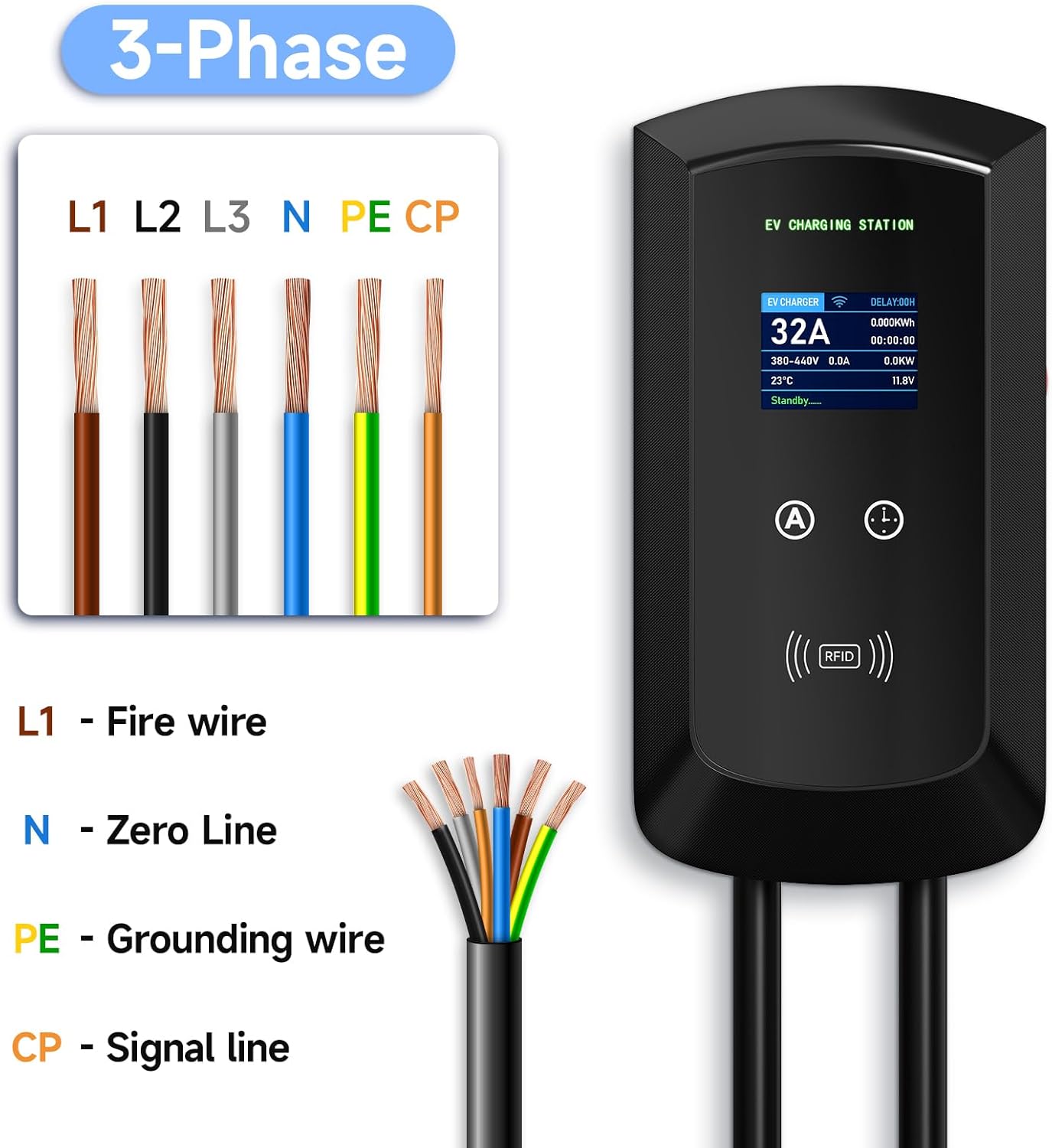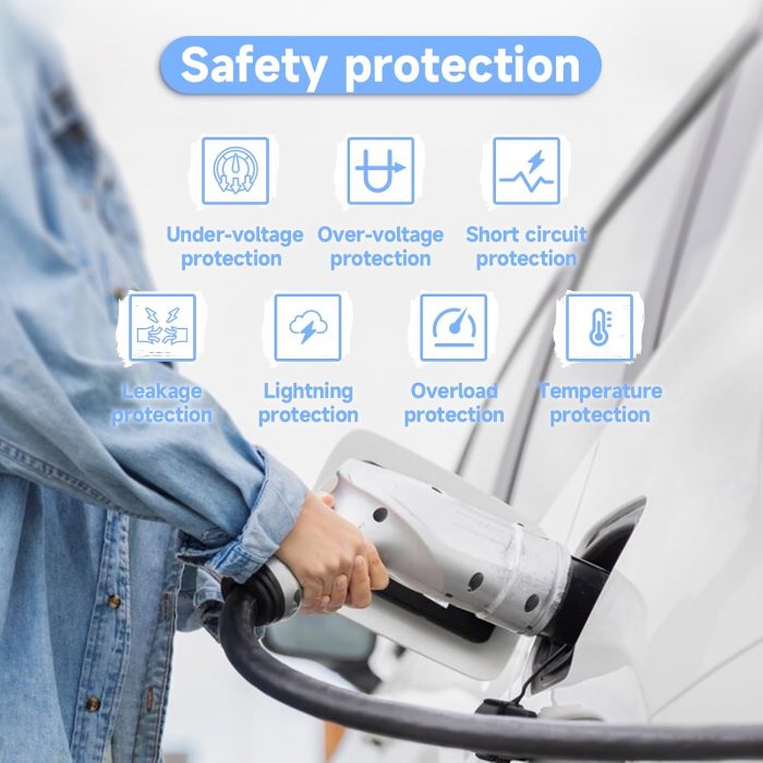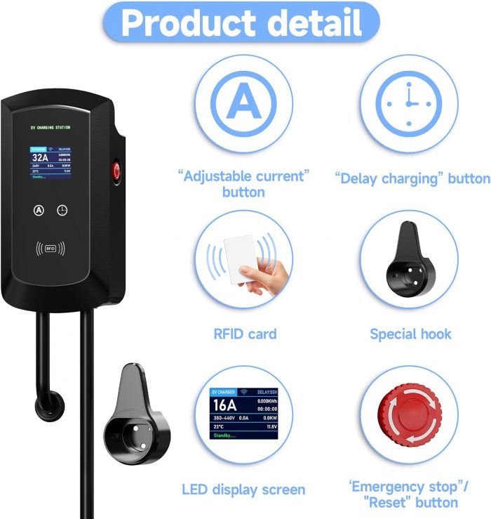 Fast Charging: Our type 2 electric vehicle charger can adjust the electric current (8/10/13/16/20/24/32A) to meet your needs in different conditions. The maximum power is 22 kW and the maximum output current is 32a, and the charging speed is much faster than that of ordinary chargers.