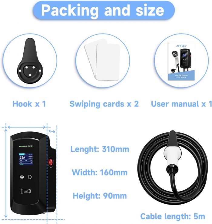 Potencia: 22kW Temperatura de funcionamiento: -30°C a 50°C Nivel de protección: IP66 Corriente ajustable: 8/10/13/16/20/24/32A Tipo de carga: Tipo 2 (IEC 62196-2) Fase: 3 fases Tensión: 380-440V Longitud del cable: 5M Tamaño: 31 cm x 16 cm x 9 cm