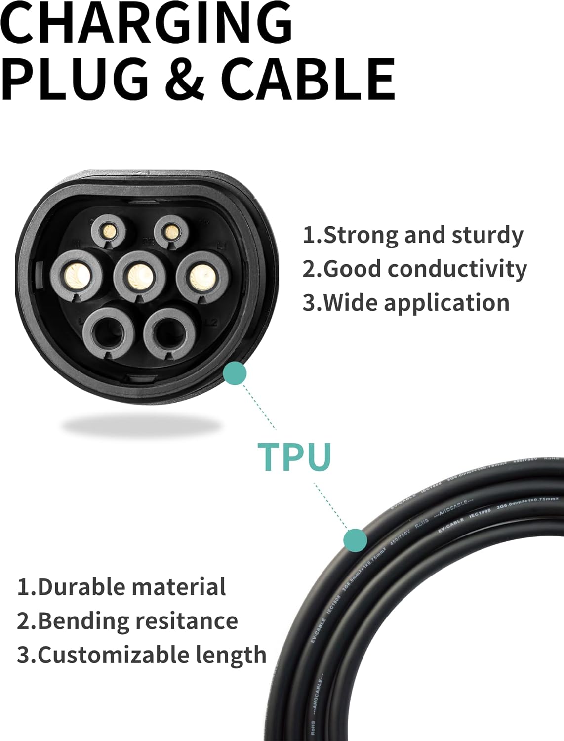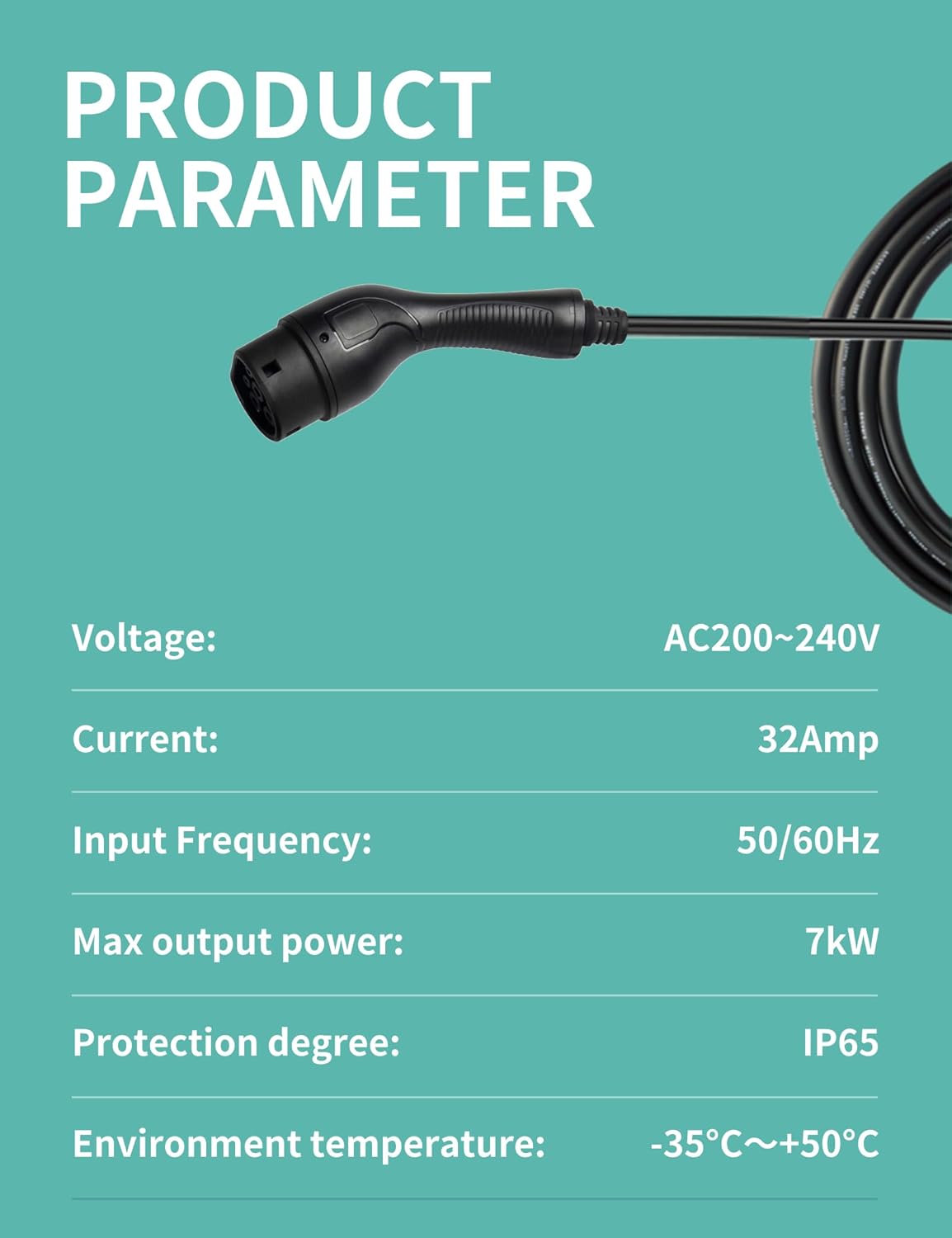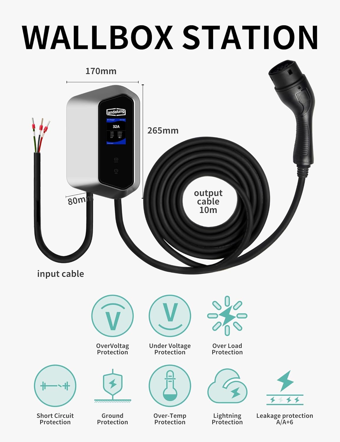 (Longitud de cable de 10 m y protección tipo B) Equipado con un cable de cobre TPU de 10 m para una conductividad óptima y un posicionamiento flexible del vehículo. La protección integrada contra fallas de corriente tipo B y la protección contra sobrecorriente, sobretensión y subtensión garantizan la máxima seguridad durante la carga.