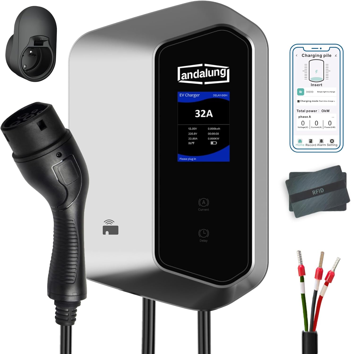 Andalung Cargador 200-250V monofásico 7 kW, Tipo 2, 6-32 A, cable de 10 m, WiFi y Bluetooth, IP65, certificado CE, Apto para todos los vehículos eléctricos