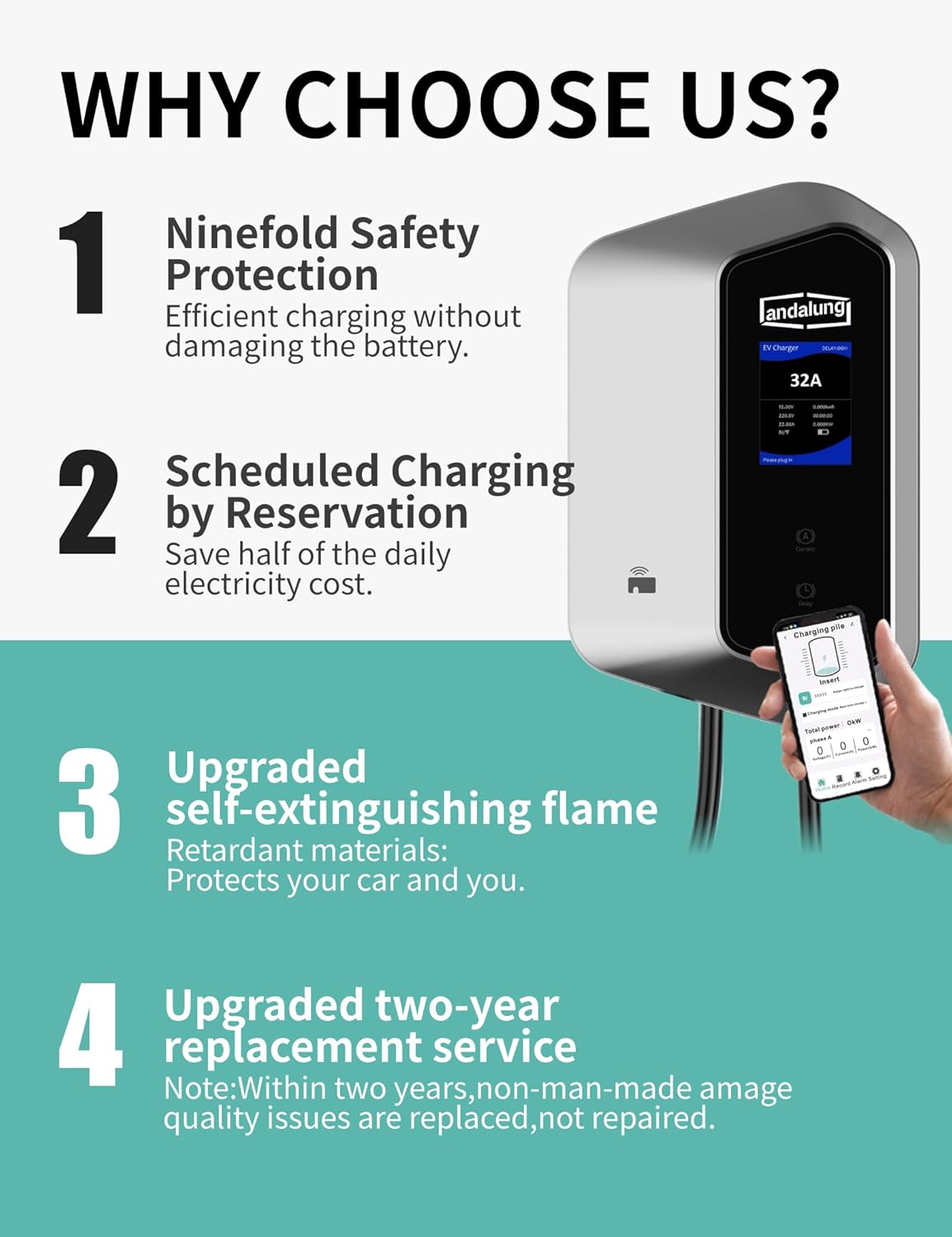 (Control de aplicación inteligente y pantalla LCD) Con dos tarjetas RFID y funcionalidad WiFi y Bluetooth, puede controlar la carga a través de una aplicación, ajustar la corriente de carga, programar tiempos de carga y ver registros de carga. La pantalla LCD muestra datos en tiempo real como potencia, corriente, voltaje y progreso de carga, por lo que el estado de funcionamiento es fácil de entender.
