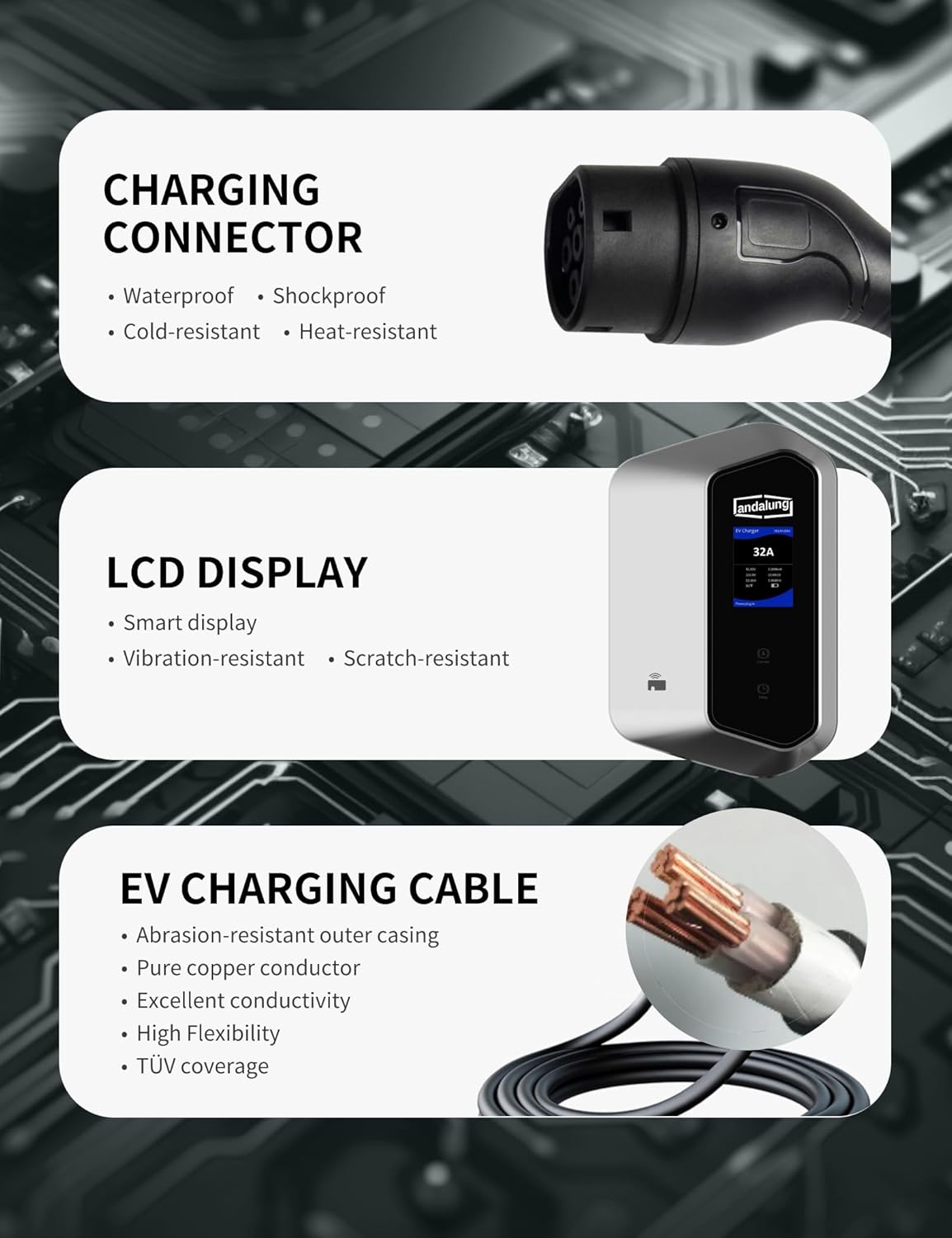 Be the first to review “Andalung Cargador 200-250V monofásico 7 kW, Tipo 2, 6-32 A, cable de 10 m, WiFi y Bluetooth, IP65, certificado CE, Apto para todos los vehículos eléctricos” Cancel reply