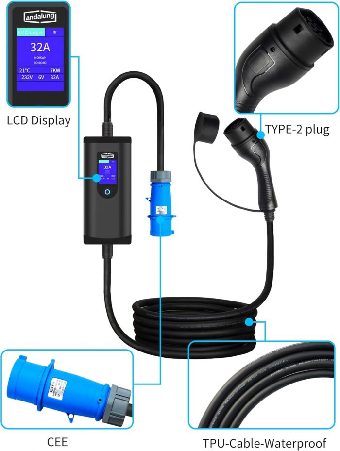 Andalung Portable EV Charger Type 2 7kW, Single Phase, 6-32A with Adjustable Current, 7 m Cable, CEE Plug, IP65 Protection, Compatible with All PHEV/EV Vehicles