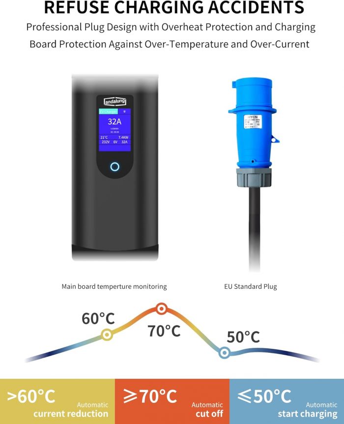 Smart Charging: Supports adjustable currents from 6A to 32A for a personalized fast charging experience. Enables APP control, WiFi and Bluetooth for monitoring and remote control