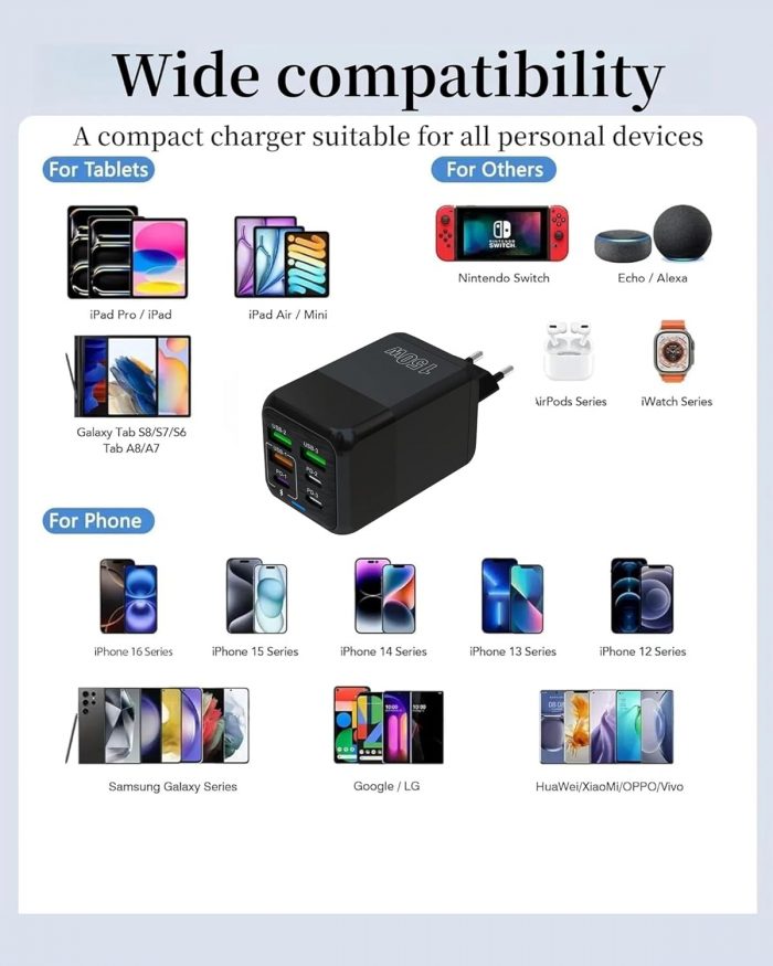 Universal Compatibility: 3PD C-port+3QC USB A-port fast charger, adapted for iPhone 16 15 14 13 12 11 Pro Max Plus/XS Max/XS/XR/8 7 6 6s Plus iPad Pro Air Mini、AirPods Pro、Apple Watch、Galaxy S23/S22/S21/S21+/S21 Ultra/S20/S22/S21+/S21 Ultra/S20/S22 0 Ultra/Small 20 FE Note 10、Note 20/20 Ultra/S10 S9 S8、Galaxy Z Fold 3、A14 A42 A53、a54 A71、Tab S7/S7+/S8/S8+、LG、Google Pixel, Motorola