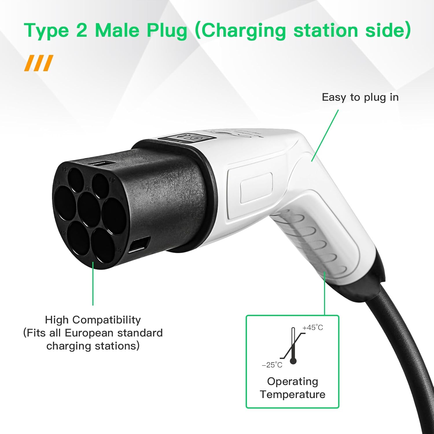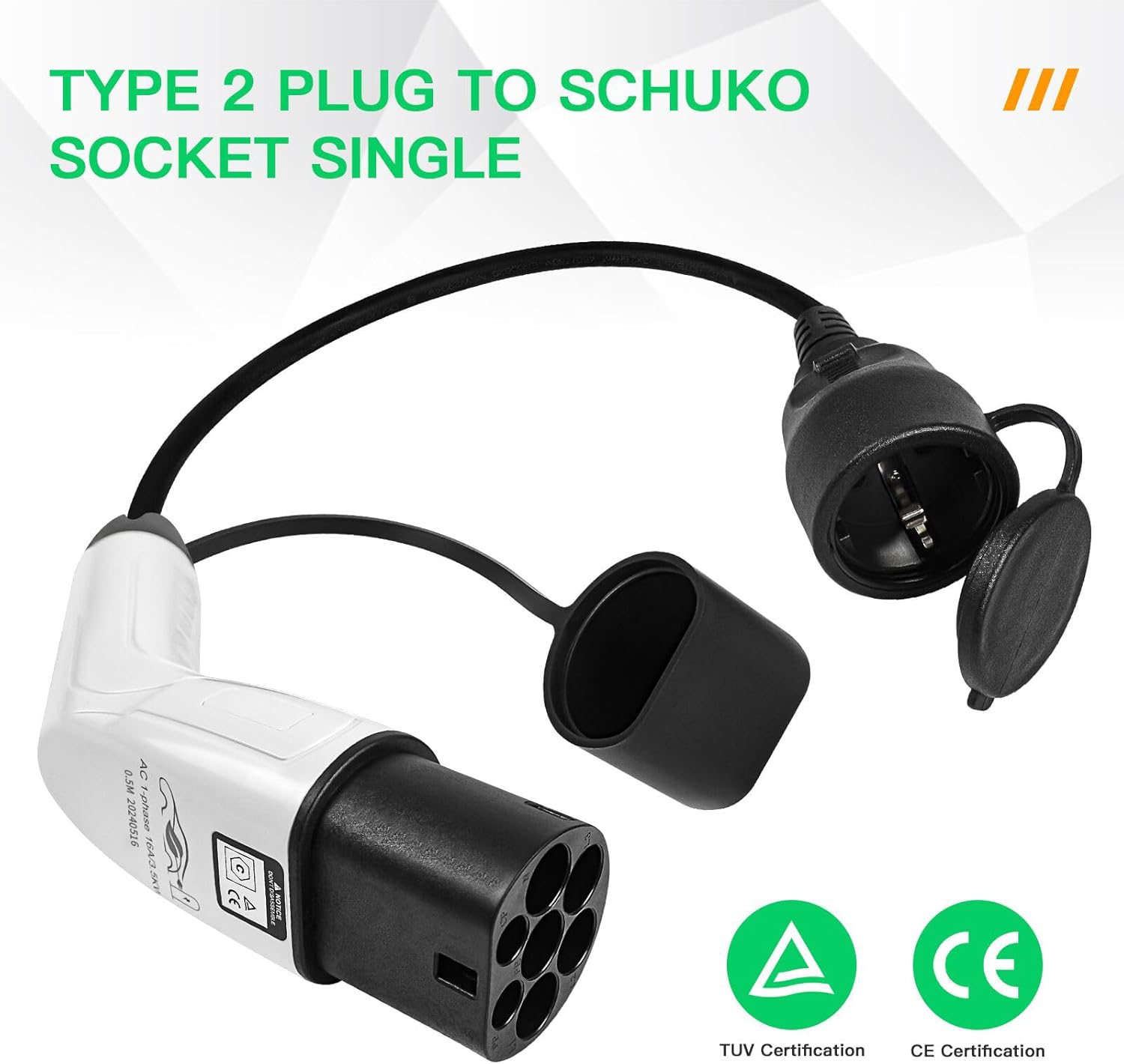 Carga rápida y segura: el adaptador tipo 2 a Schuko tiene certificación CE y TUV, un rango de temperatura de funcionamiento de -25 ℃ a +45 ℃, voltaje nominal: CA 250 V, potencia nominal: 16 A, puede suministrar energía rápidamente a sus vehículos eléctricos, ahorrando más tiempo.