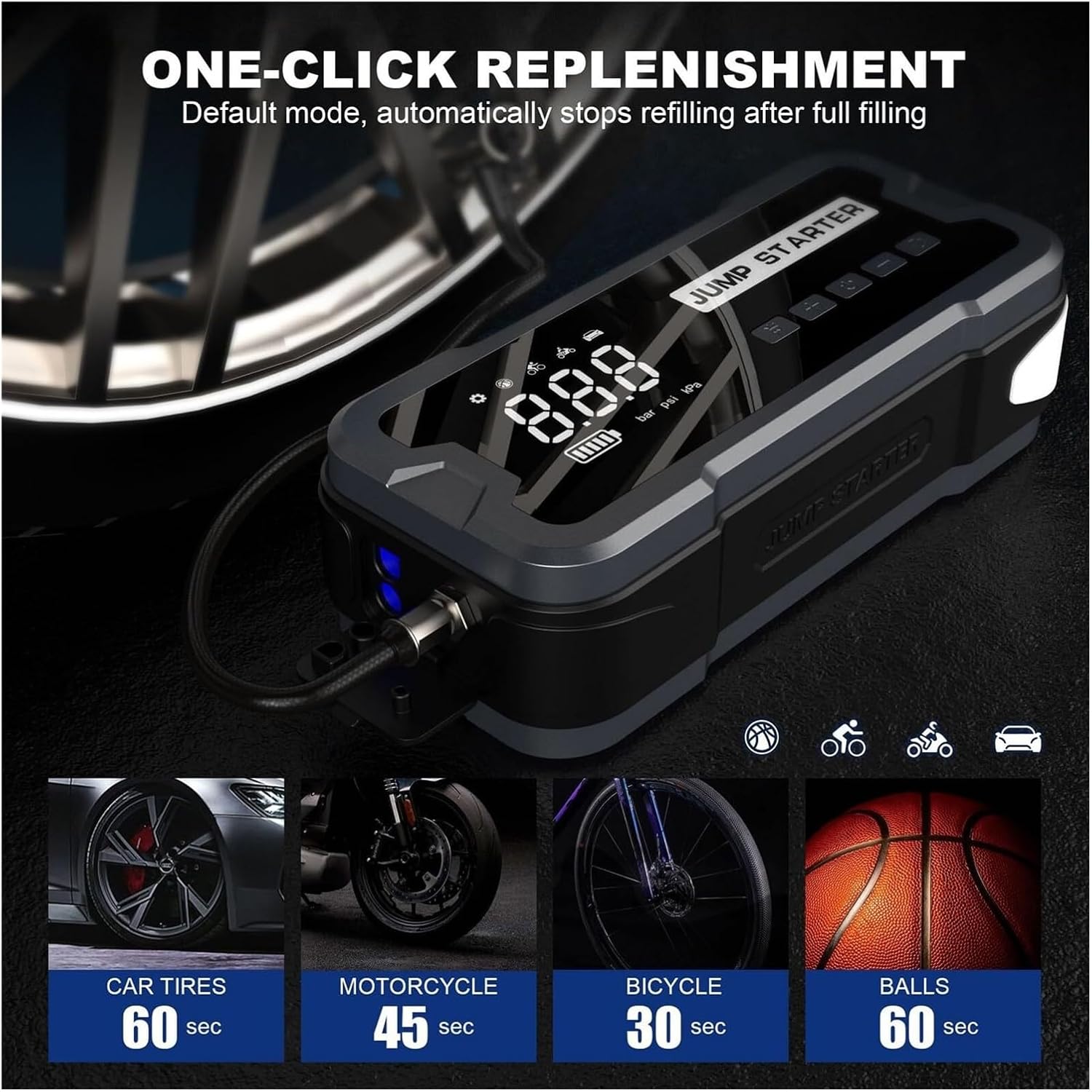 El mejor aliado for la carretera: Nuestro arrancador portátil 4 en 1 con compresor de aire garantiza la seguridad de tu familia en la carretera. Con un potente arrancador de 8000 A, disfruta de tranquilidad durante tus viajes.