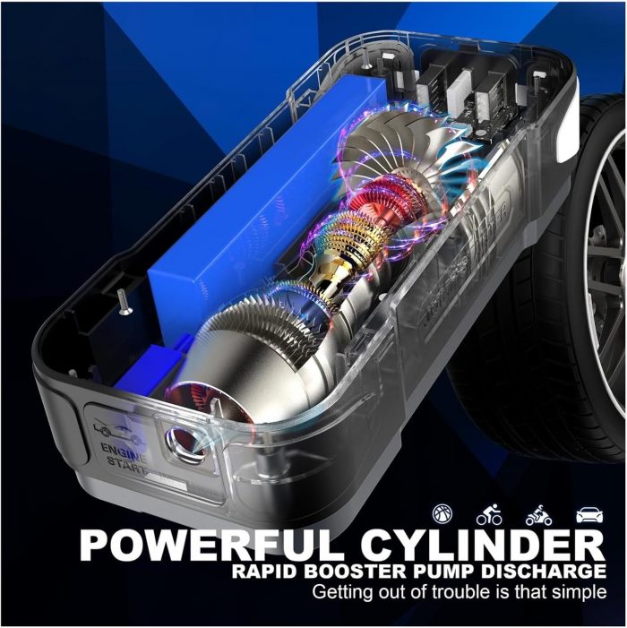 Infla tus neumáticos como si fueras una bomba de inflado: Prepárate for los pinchazos con nuestro arrancador que también funciona como bomba de inflado. Apto for coches, motos y equipos deportivos. Mantente seguro con los neumáticos correctamente inflados.