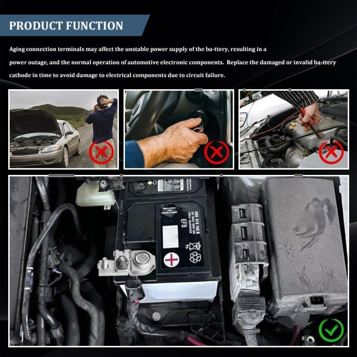 [Function] : The positive battery post is mainly used to replace damaged connection terminal, avoid power failure due to insufficient power supply, make the normal operation of automotive electronic components and protect electrical components from damage