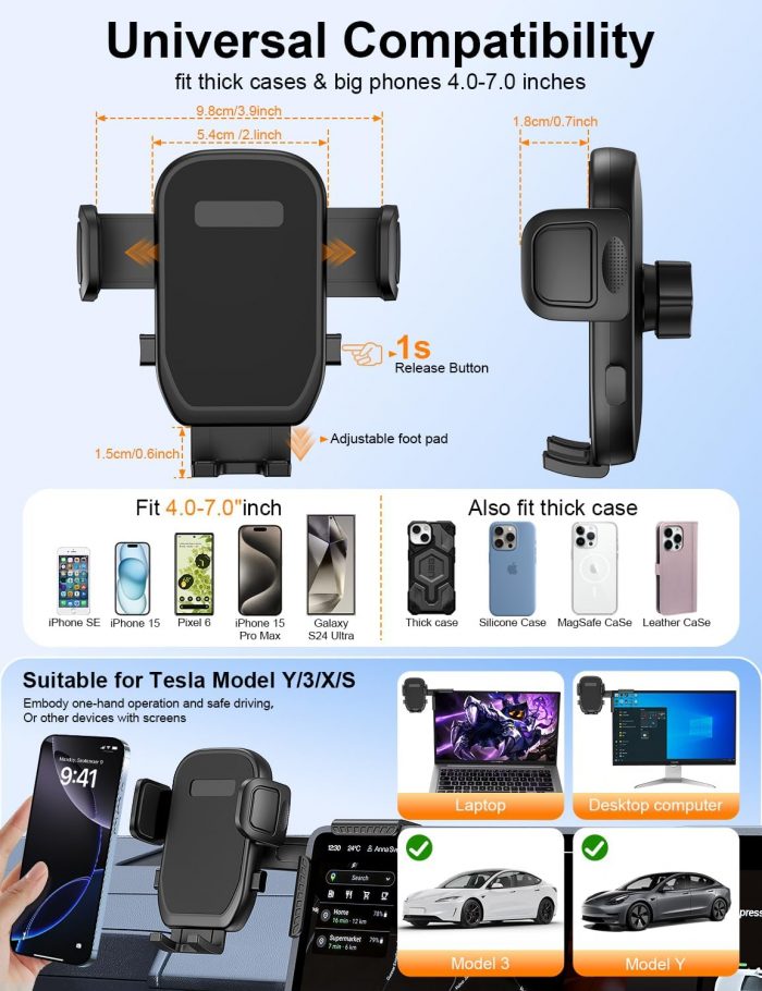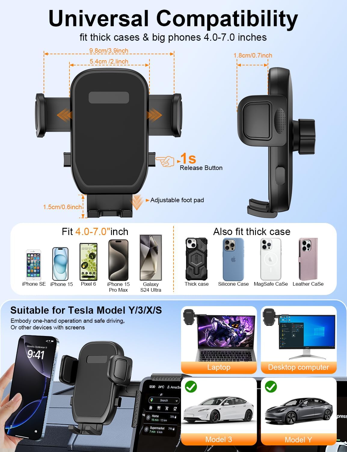 SPECIFICALLY DESIGNED FOR Tesla – This phone holder for Tesla Model Y is specially designed for Tesla models, perfectly fits Tesla Model Y(Juniper)/3(Highland)/X/Cybertruck center console, making your car upgrade instantly and enjoy a more comfortable driving experience. It can also be used for other screens (thickness between 0.2-0.63 inch).