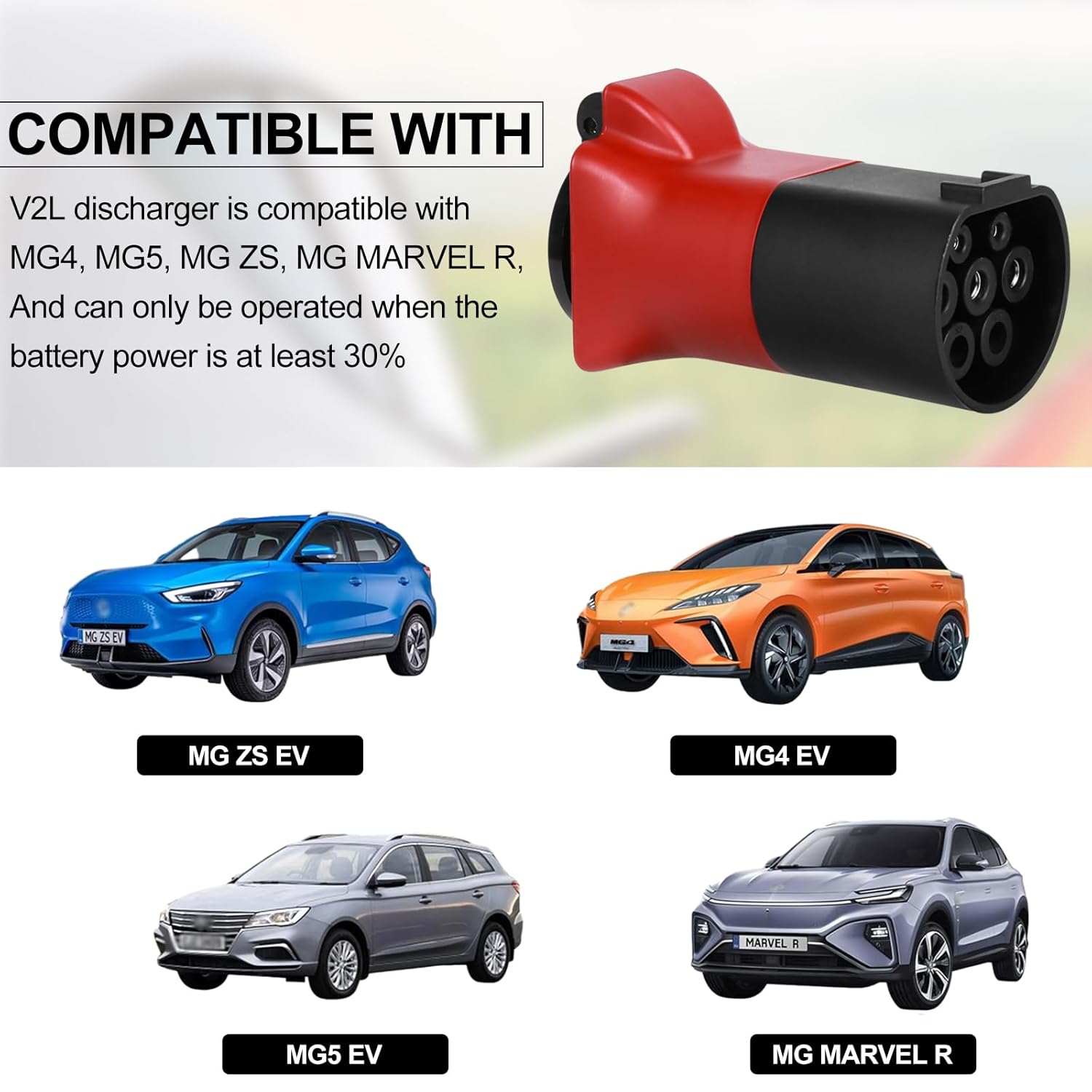 【Compatibilidad】 Este descargador de adaptador V2L es adecuado para una variedad de modelos, incluidos MG4, MG5, MG ZS y MG MARVEL R, etc. Garantice la compatibilidad y el funcionamiento confiable cuando la carga de la batería supere el 30%.