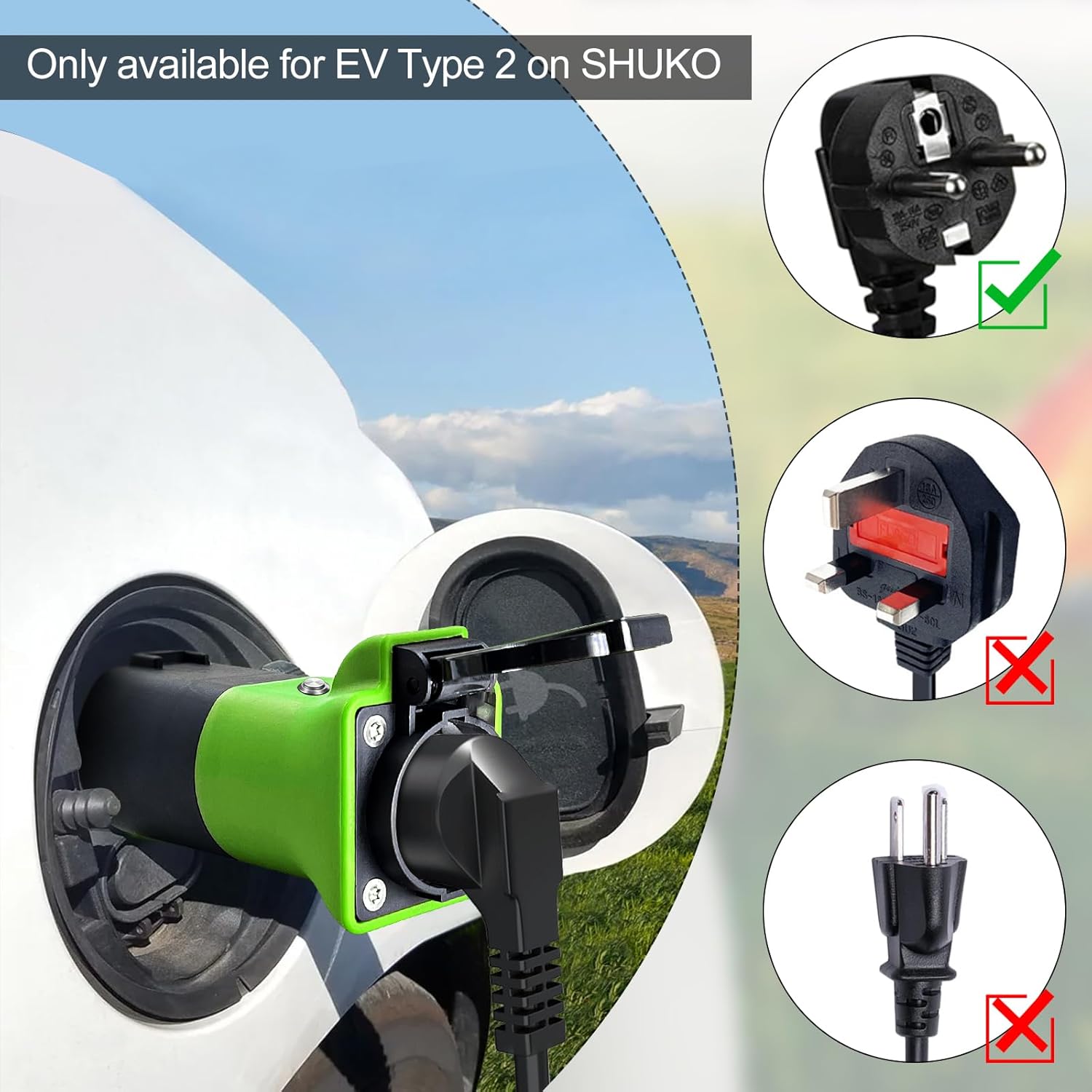🚗【Portátil y Multifuncional】 El cable de carga Schuko Tipo 2 es liviano, pesa solo 235 gy mide 11 cm de largo. Se puede colocar en cualquier lugar del automóvil y en el tomacorriente se pueden cargar computadoras, hervidores, barbacoas y focos.