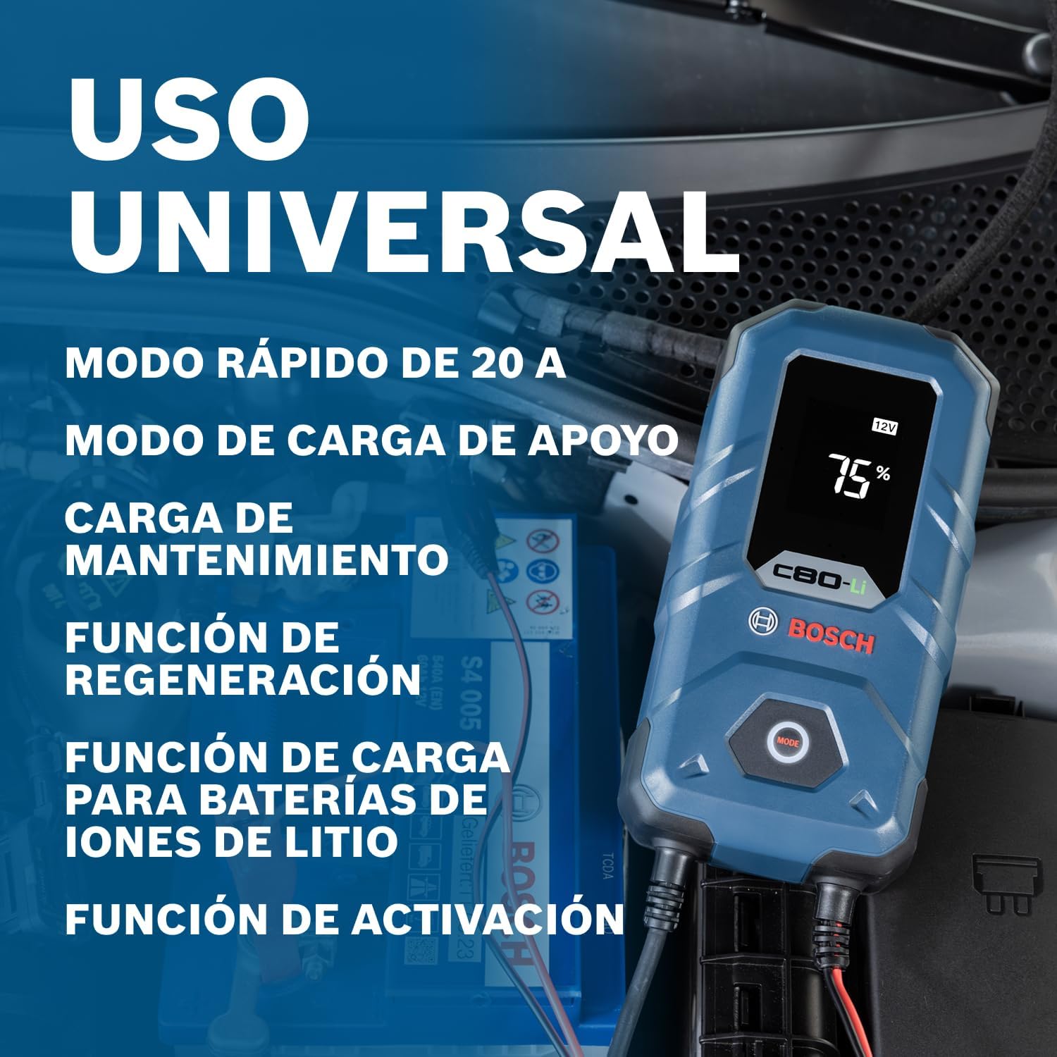 Contenido: 1 cargador de batería Bosch C80-Li con gancho, cable de red, cable de carga con pinzas, cable adicional con ojales y una práctica bolsa de transporte