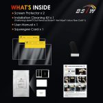 Package Contents: 2 x Screen Protector, 1 x Microfiber Cloth, 1 x Wet Cloth, 1 x Dust Removal Sticker, 2 x Placement Labels, 1 x Scratching Paper