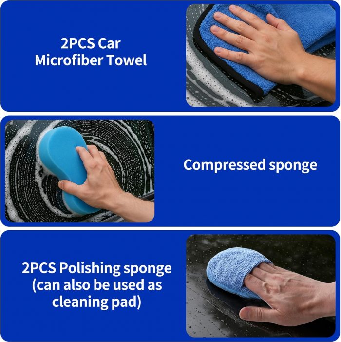 Multitude of cleaning accessories to care for your car paint: With wool pads, microfiber sponges, car wash mitts and other highly absorbent and soft and anti-scratch, you can easily deal with the car body, can be easily used for car cleaning, and car wash mitts. No scratch, easy to clean car surfaces and interiors