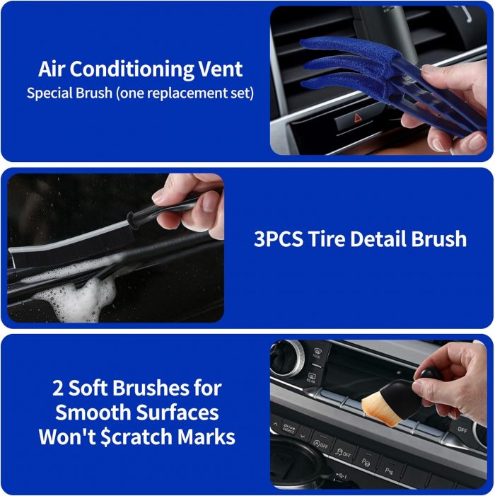 Multi-size detailing brush: mix of bristles and microfiber material, suitable for cleaning car vents, dashboards, seat crevices and other hard-to-reach areas, no damage to surfaces, wet and dry