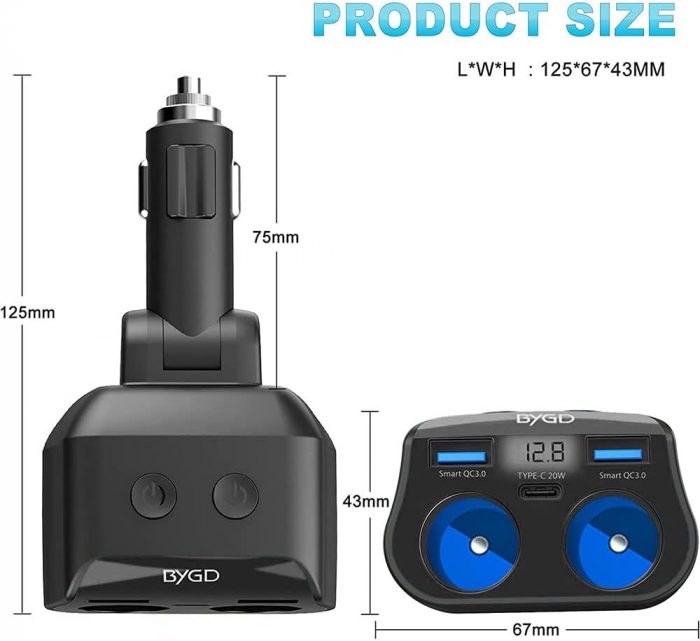【DOUBLE CIGARETTE LIGHTER + DUAL USB + TYPE C】 It can be connected to 5 electronic devices at the same time, such as GPS, dash camera, Satnav, seat heater, portable refrigerator, handheld vacuum cleaner or other portable appliances in your 12V / 24V vehicle.