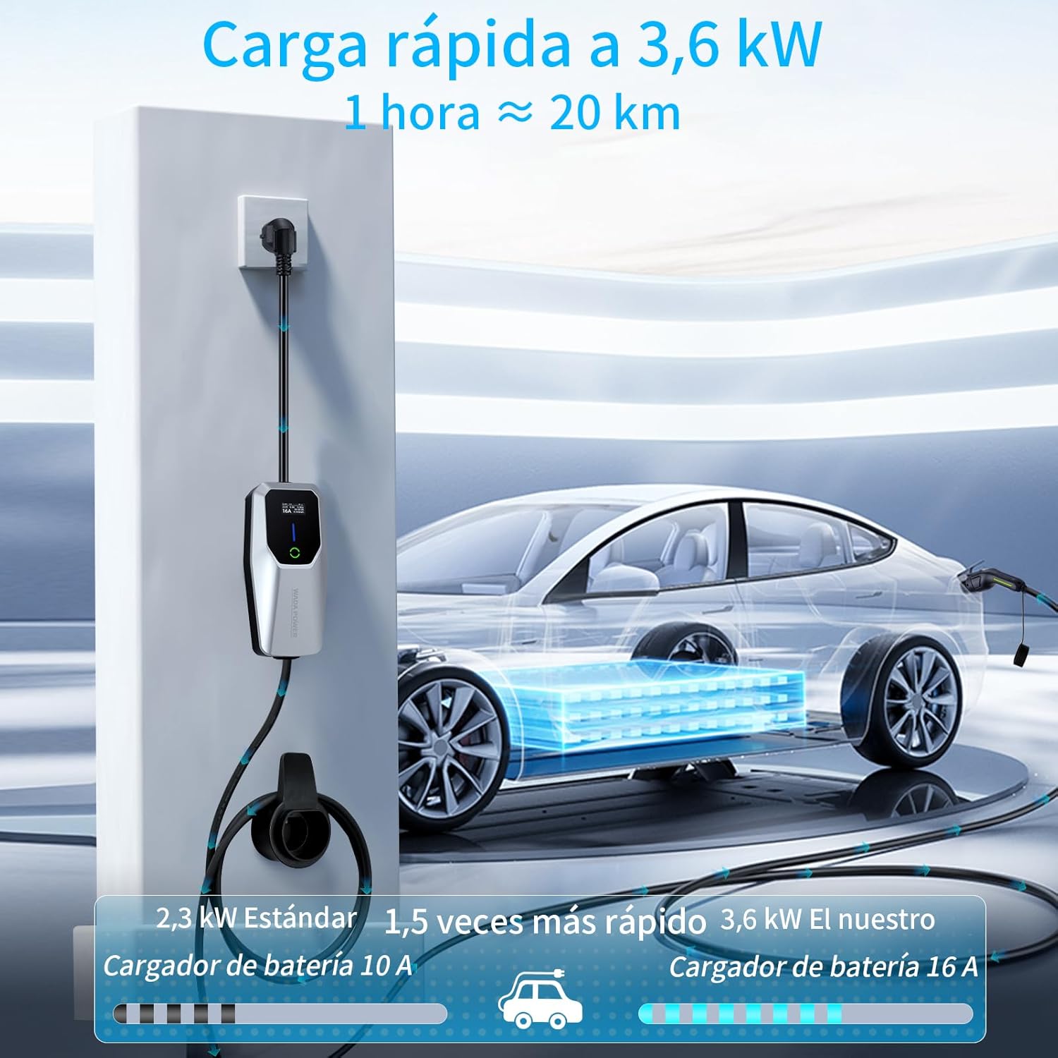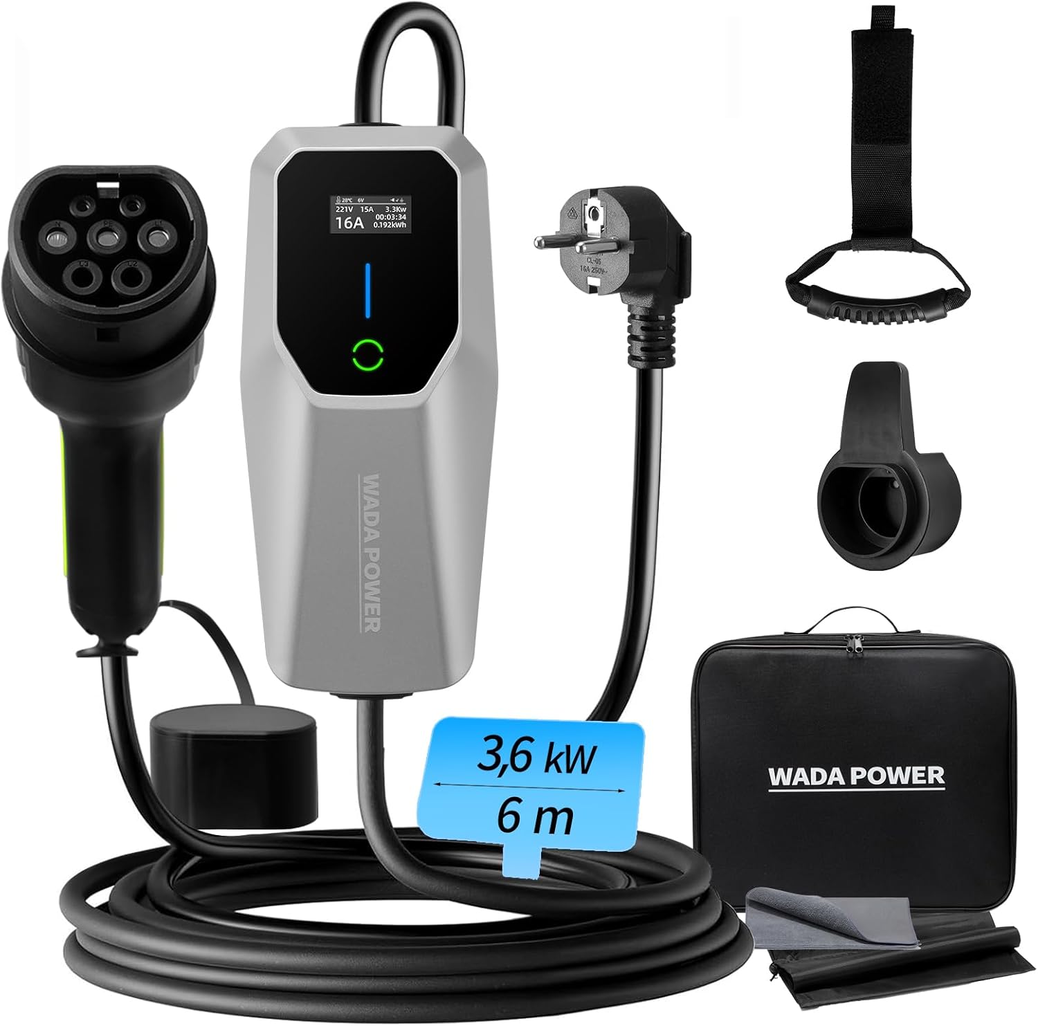Cable Carga Coche Eléctrico 3.68KW: Cargador Coche Eléctrico Monofásico Portátil Tipo 2 con Enchufe Schuko, Cargador EV con Control Digital LCD, 6-16A, Cable 6 Metros, IEC 62196-2
