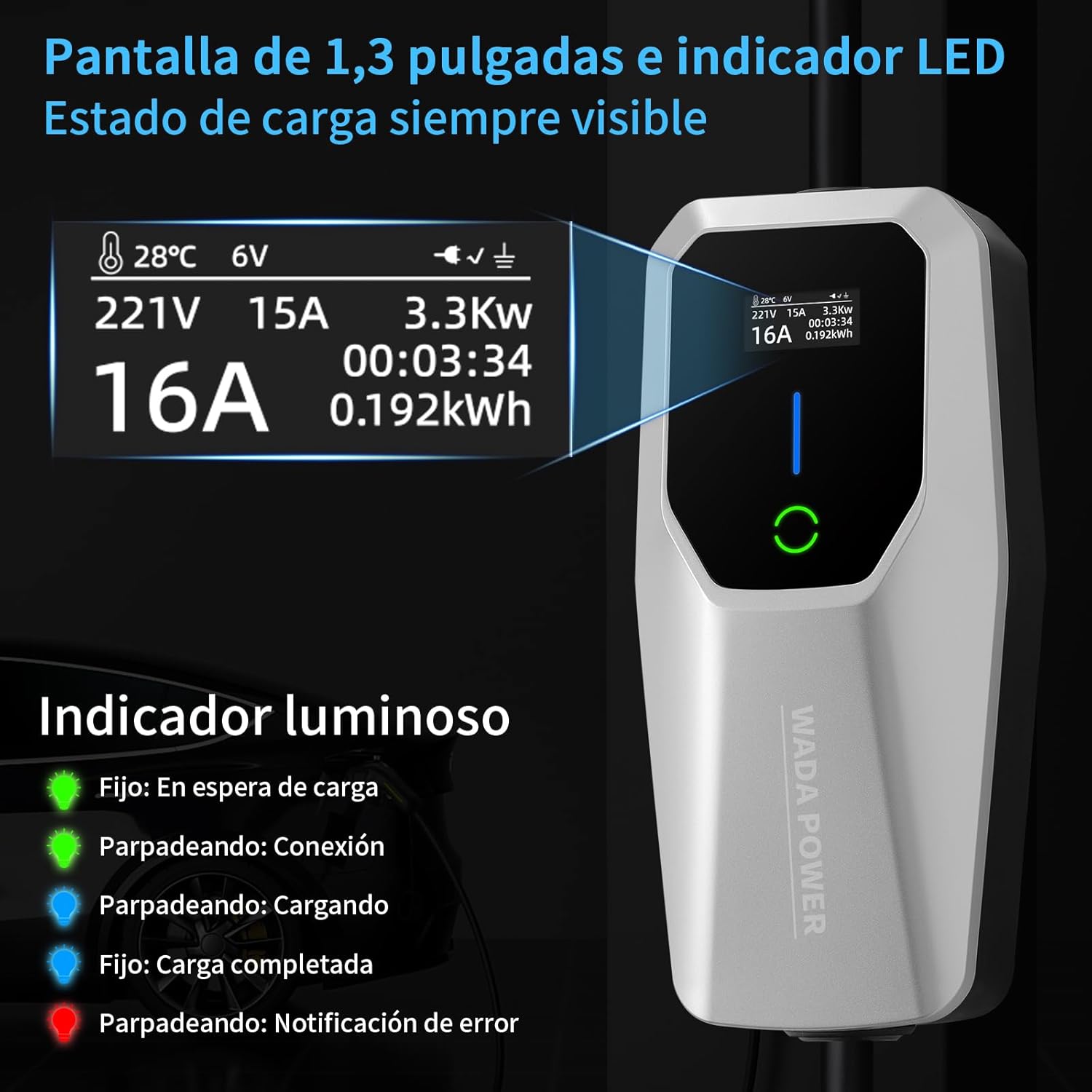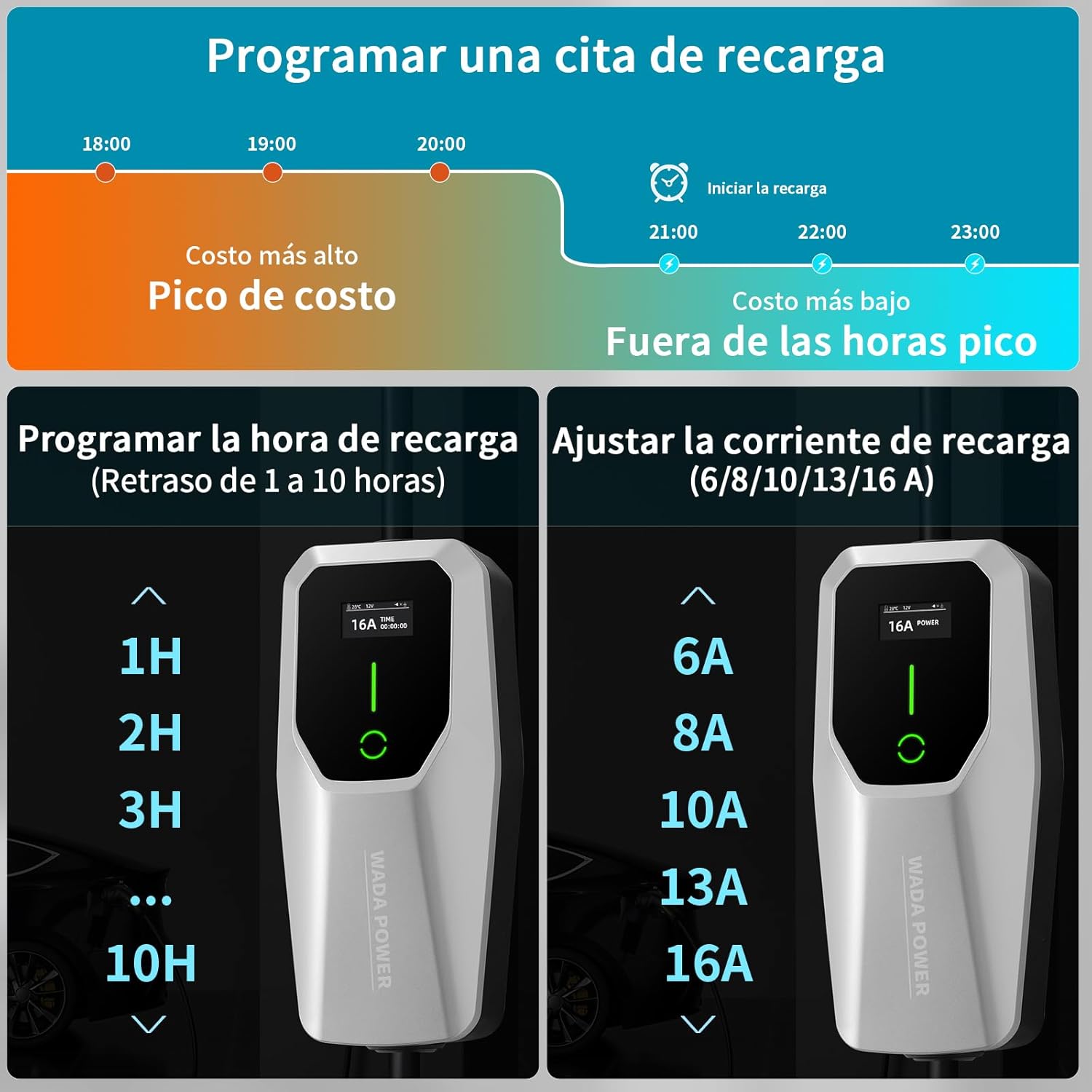 Envío rápido desde Roma. 【Carga Rápida y Estable】 El cargador para coche eléctrico WADA POWER carga tu vehículo eléctrico con una potencia máxima de 3,68 kW. El cargador ev tipo 2 ofrece 5 niveles de corriente ajustables: 6A/8A/10A/13A/16A. Además, podrás establecer un tiempo de carga programado, con un retraso de 1 a 10 horas, para evitar tarifas elevadas en las horas punta.