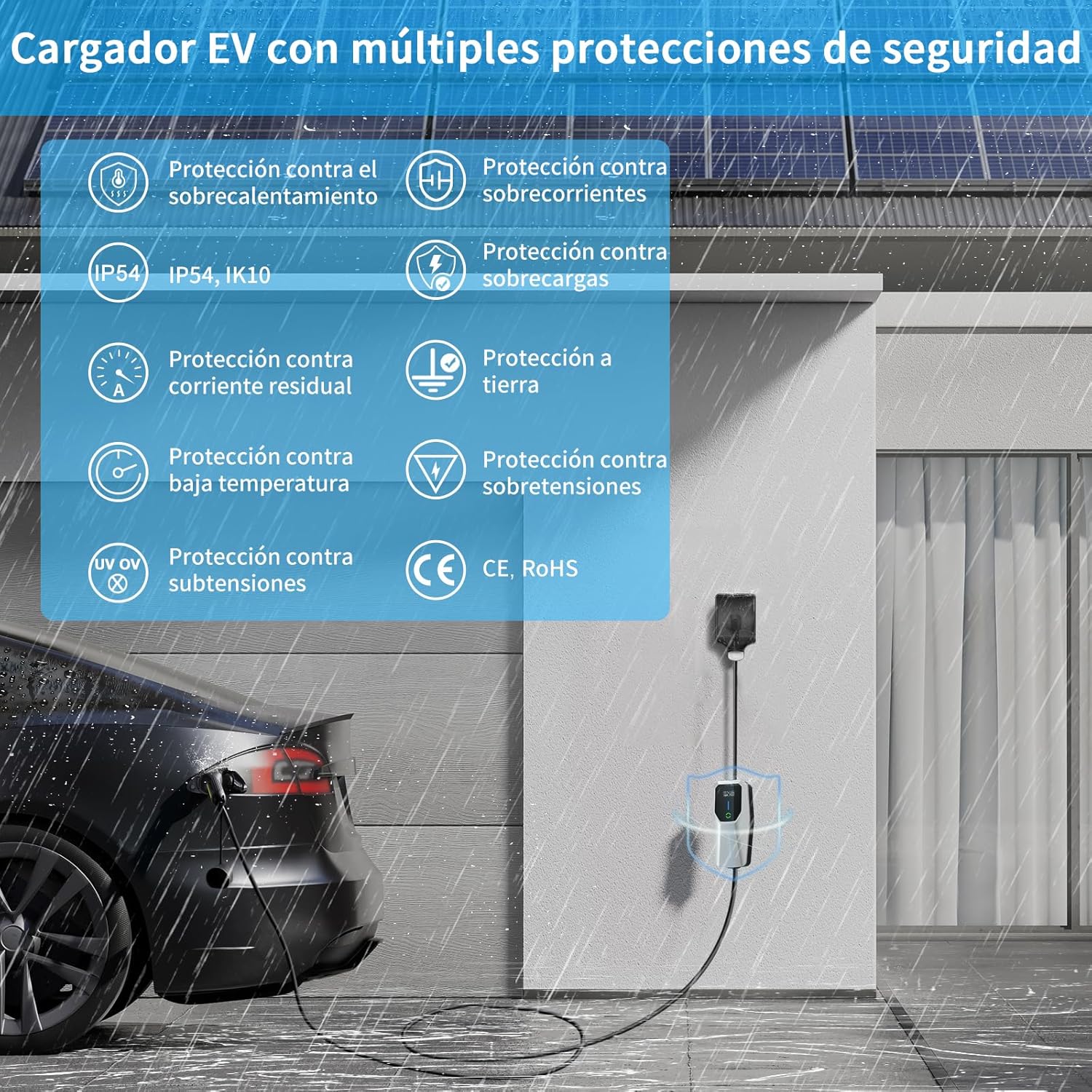 【Múltiples protecciones de seguridad】 El cargador del vehículo eléctrico está equipado con un enchufe resistente y un cable de TPU para garantizar una carga más segura y estable. Además, el cable cargador para vehículos eléctricos cumple con las certificaciones CE y ofrece protección completa contra el agua (caja de carga IP65 y cabezal de carga IP54), dispersión de corriente, rayos, cortocircuito, sobretensión, sobrecalentamiento y sobrecarga, lo que garantiza una carga segura en cualquier condición climática.
