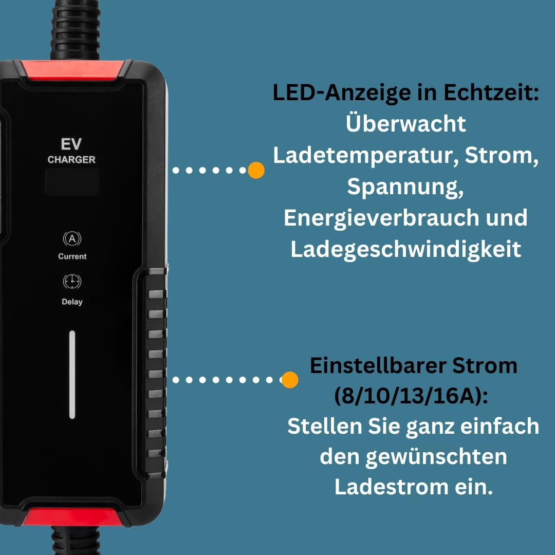 Dé Cargador de Coche Eléctrico (3,68kW, 6-16A, 10m) Cargador EV Tipo 2 con Enchufe Schuko, Cargador de Coche Eléctrico Portátil con Pantalla Digital Controlable con Modelo Y/3, GLC, MG4 y Otros BEV/PHEV