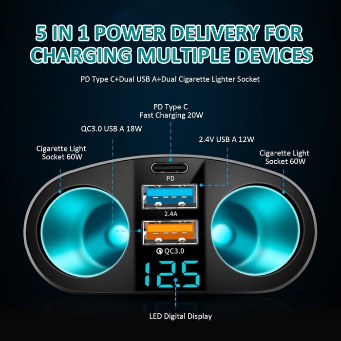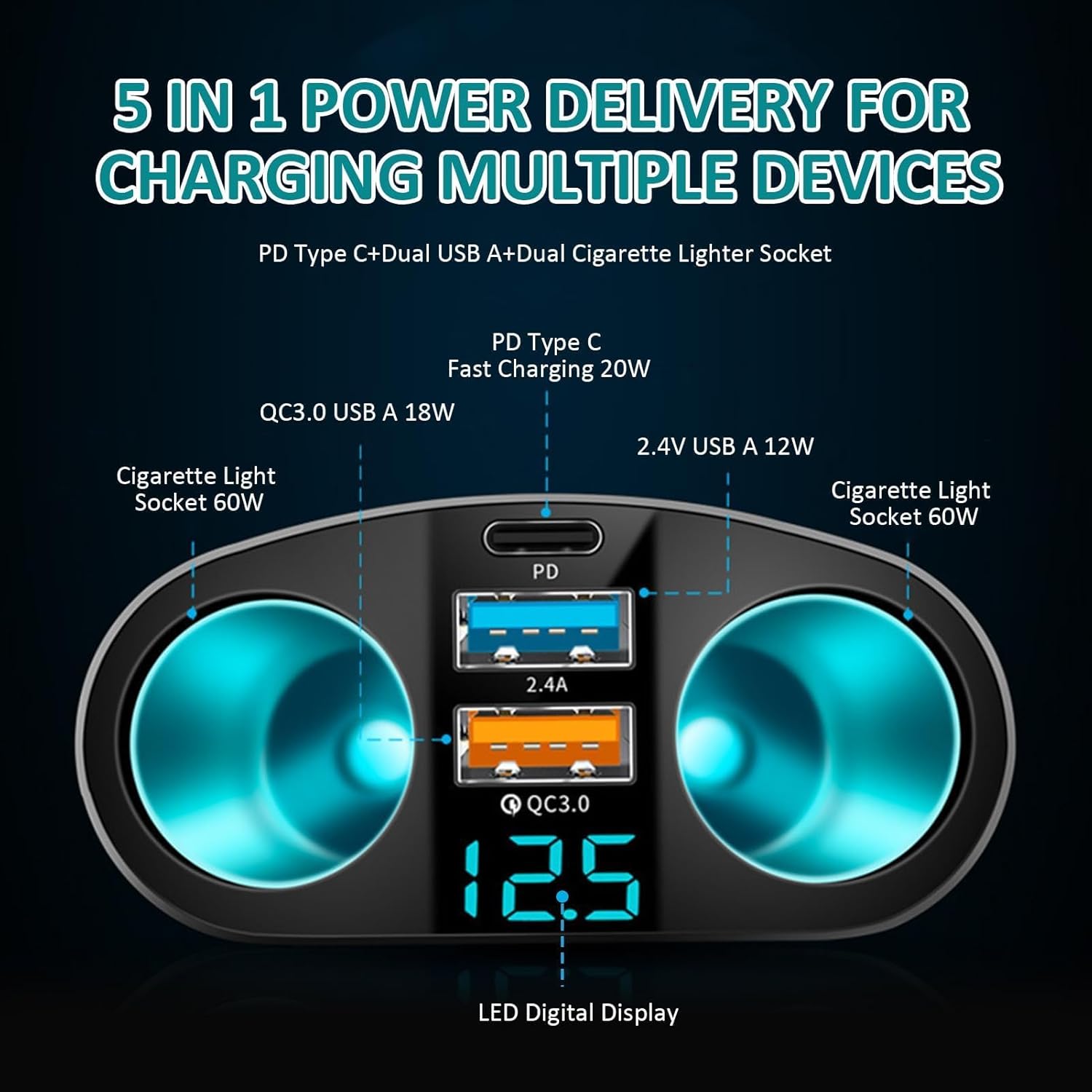 【Advanced 5-in-1 Charger】This dual USB car cigarette lighter adapter easily plugs into the vehicle’s cigarette lighter socket, eliminating extra cables and keeping the car tidy. With built-in blue LED lights, finding shots in low light conditions is easy, improving convenience and usability. Its compact and stylish design integrates seamlessly with the interior of the car.