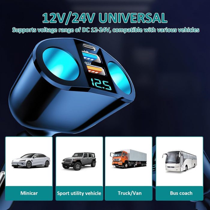 【Versatile Design for Various Vehicles】 Compatible with a wide range of vehicles operating in 12-24V DC, including trucks, SUVs, off-road vehicles and buses. Anti-interference design ensures that the car cigarette lighter adapter will not interfere with car navigation, DVR, audio systems or other electronic devices, providing a safer and more reliable charging experience.