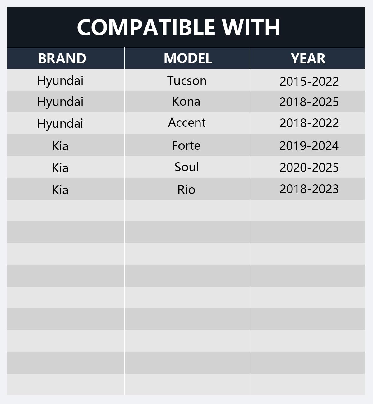 Suitable Models: Fit for Hyundai Kona 2018-2025, Accent 2018-2022; Kia Sportage 2011-2025, Forte 2019-2024, Soul 2020-2025, Rio 2018-2023, which have single horn due to different years or configurations