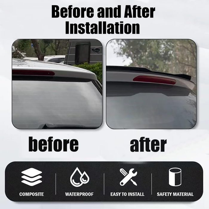 【Easy Installation】No drilling needed, install it with super adhesive double-sided tape. First clean the surface of the target with detergent, compare the installation position, then cut a small film of adhesive tape, stick the spoiler, and finally remove the remaining adhesive tape film, press firmly to complete the installation. (It can also be installed by drilling, which is firmer).