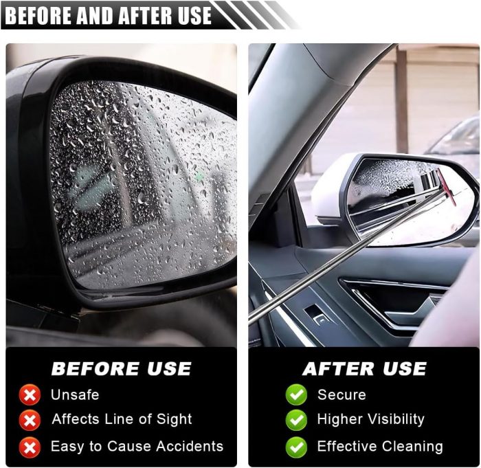 【Stay Safe on the Road】: Be prepared, confident, and safe on every journey. With this mirror wiper, you can do efficient mirror cleaning without leaving the driver’s seat, ensuring clear views and safe driving, even on rainy days.