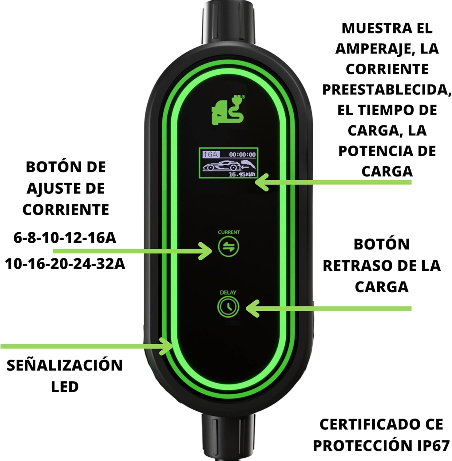 ❤【FUNCIONALIDAD Y LONGITUD IDEAL】Con 6,5 metros, este cargador cubre tus necesidades diarias. Ajuste la corriente fácilmente y guarde su configuración automáticamente. Además, su protección IP67 lo hace ideal para usar bajo la lluvia y en ambientes húmedos.