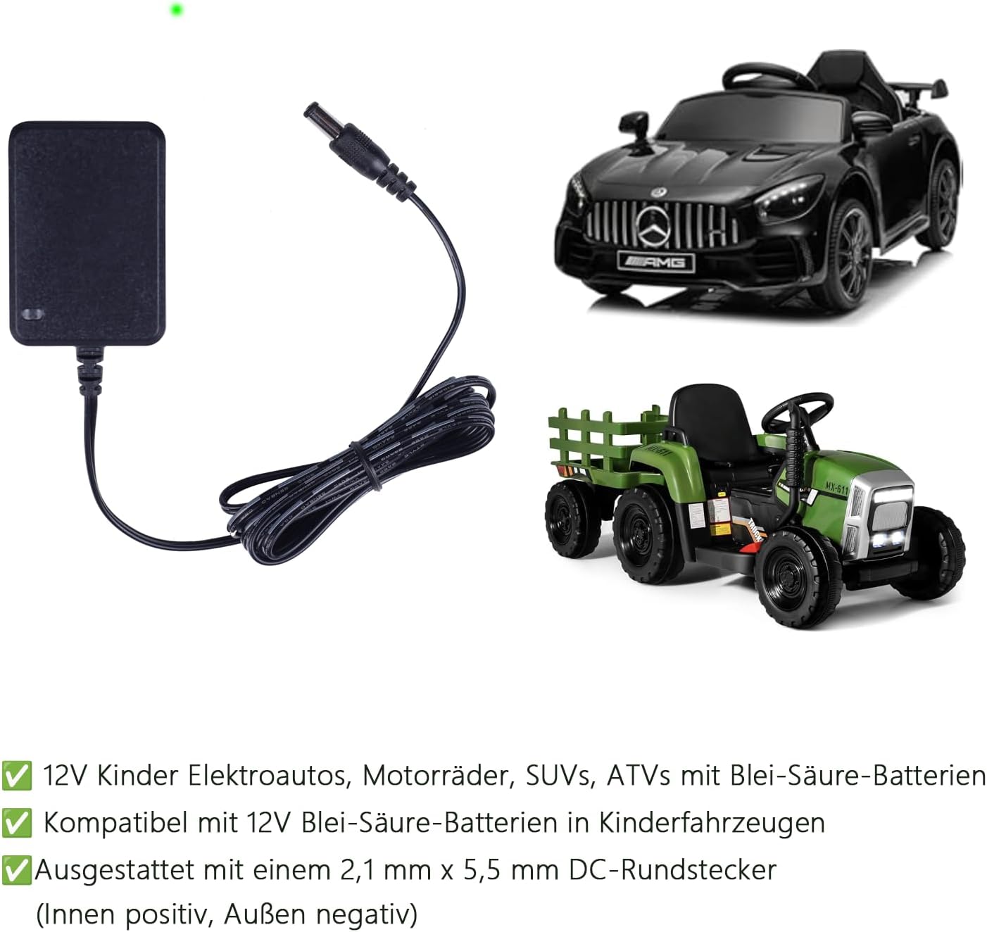 3. Compatible con conectores CC estándar. Equipado con un conector CC redondo de 2,1 mm x 5,5 mm (positivo interior, negativo exterior), compatible con la mayoría de los vehículos para niños de 12 V con batería de plomo-ácido. Verifique el conector de su vehículo antes de comprar.
