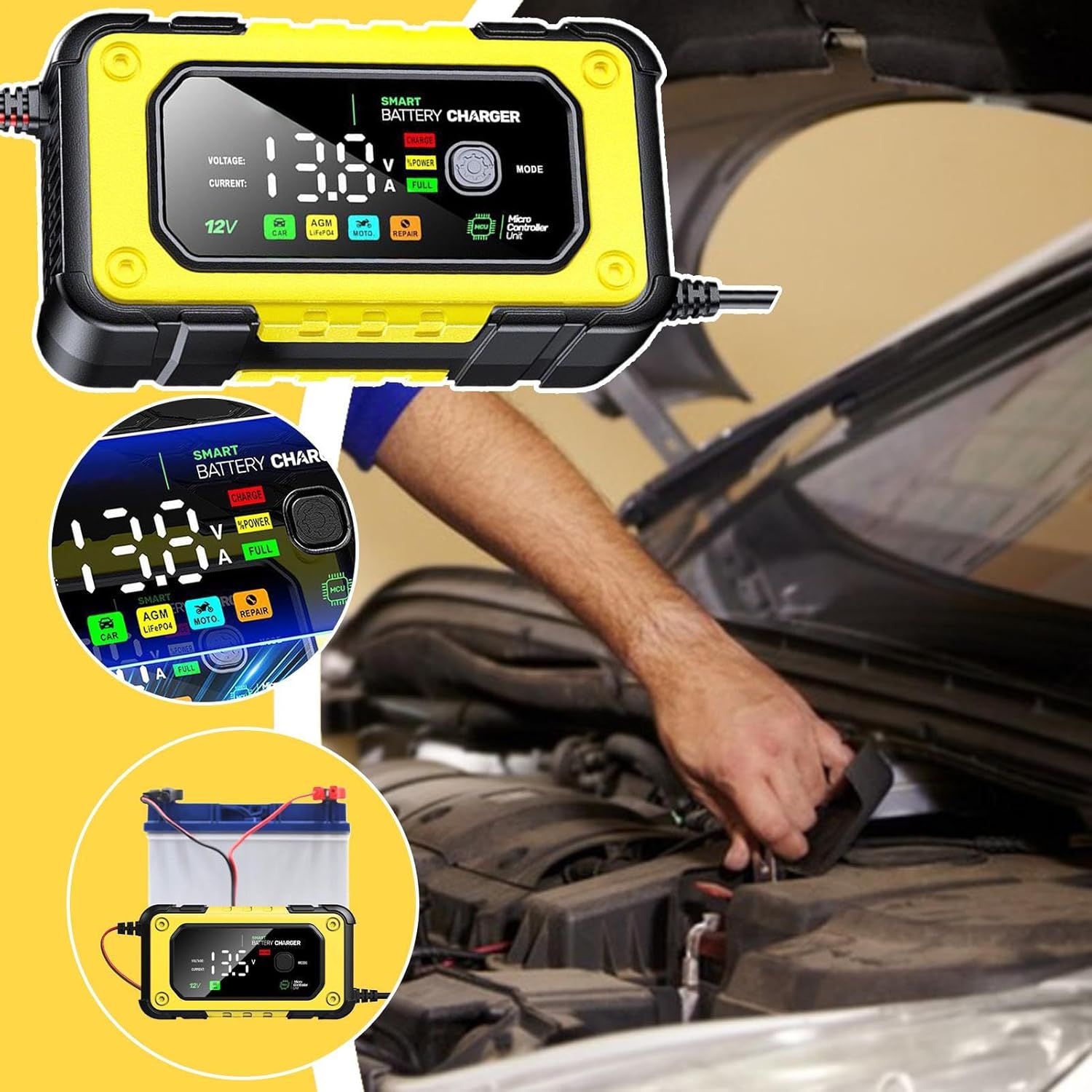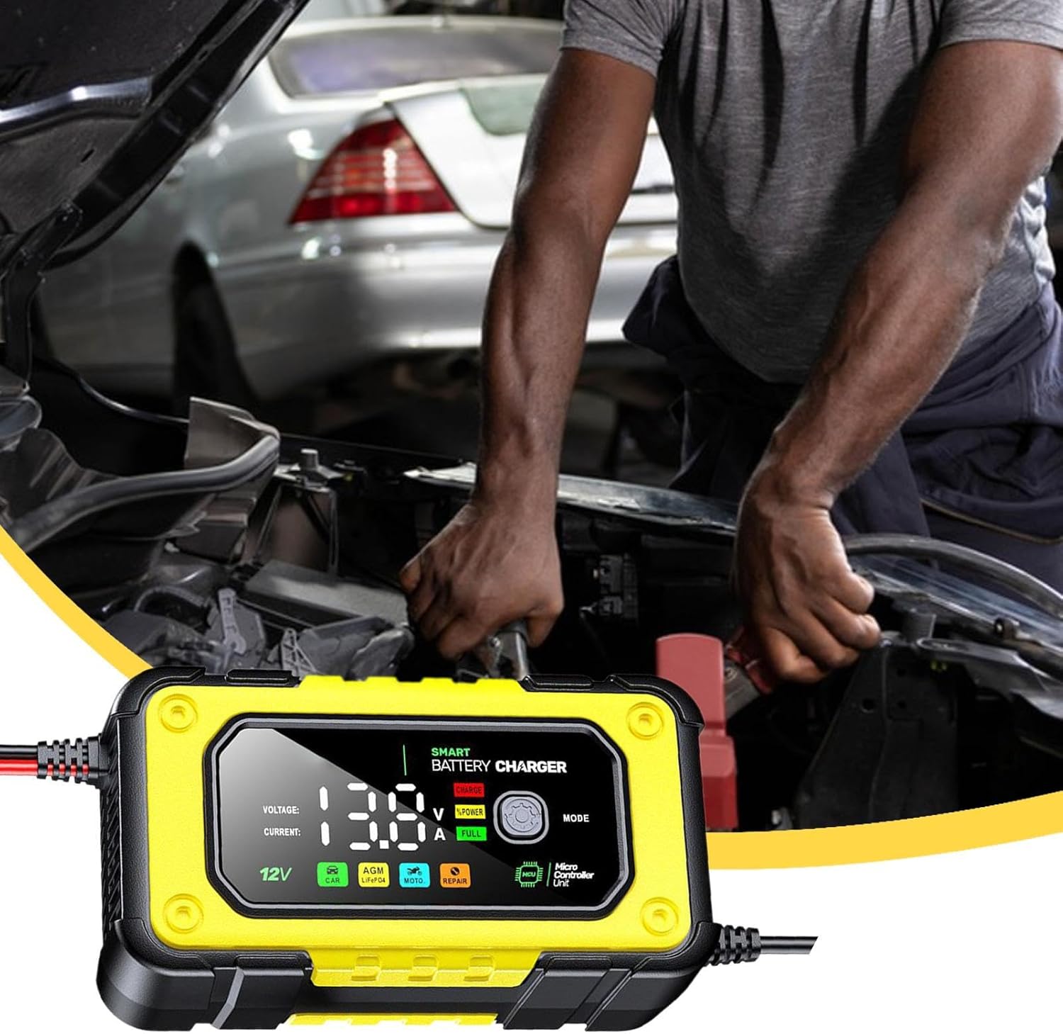 Cargador De Bateria De Coche | Mantenedor De Batería De Vehículo 12V 7A | Pantalla LCD Color para Coche Camión Moto Bote | Equipo De Carga Para Garaje Y Exteriores