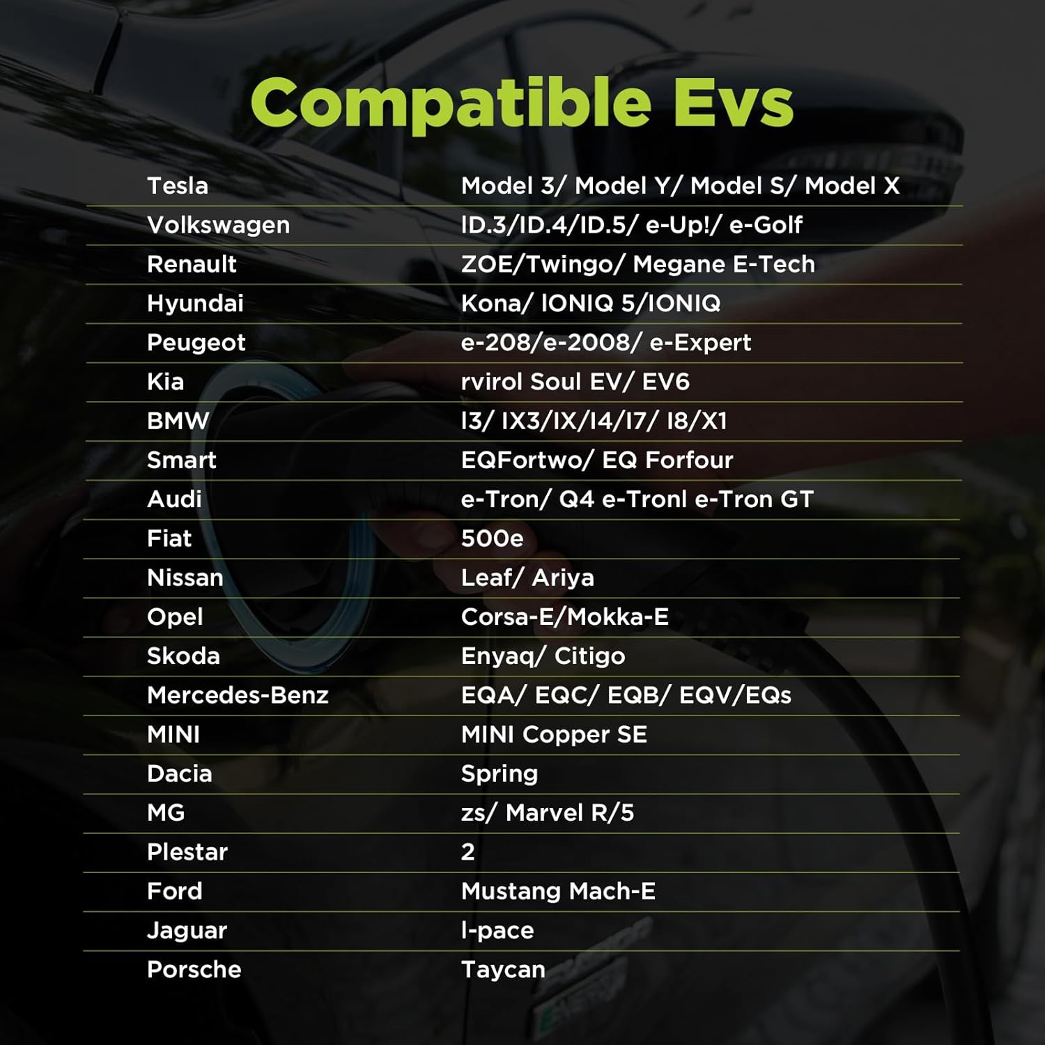 (ALTA COMPATIBILIDAD) Todos nuestros productos han pasado la certificación CE y la calidad es confiable. Nuestro cargador para vehículos eléctricos es compatible con vehículos eléctricos más grandes que cumplen con la norma IEC 62196-2. Si no está seguro de qué tipo de cargador (Tipo 1/Tipo 2) necesita su automóvil, consulte la página de coincidencia de modelos en la página del producto o comuníquese con Servicio al Cliente.