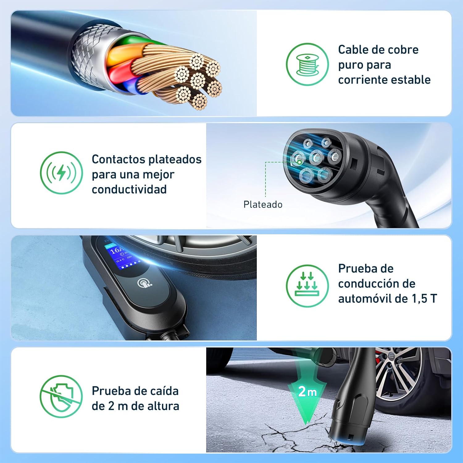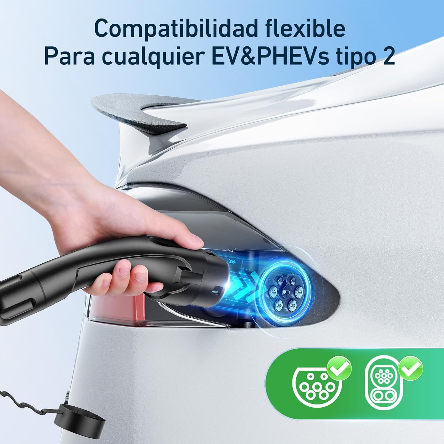【Compatibilidad】 Todos nuestros cables de carga para automóviles eléctricos tipo 2 han pasado pruebas de calidad confiables. Nuestros cargadores para vehículos eléctricos son compatibles con la mayoría de los vehículos eléctricos que cumplen con la norma IEC 62196-2. (ID.3, ID.4, ID.5, e-Golf, e-Up, Model Y, Model 3, Spring, Kona, Ioniq 5, e-tron, i3, i4, 500, etc.)
