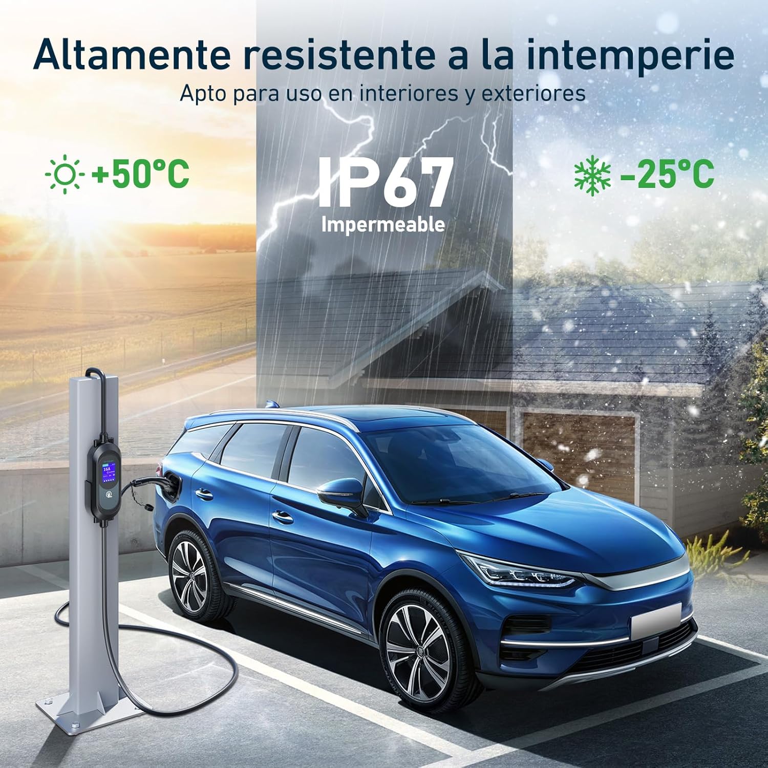 Nuestro cargador de coche eléctrico, caja de control y conector hembra de carga son todos resistentes al agua IP67.