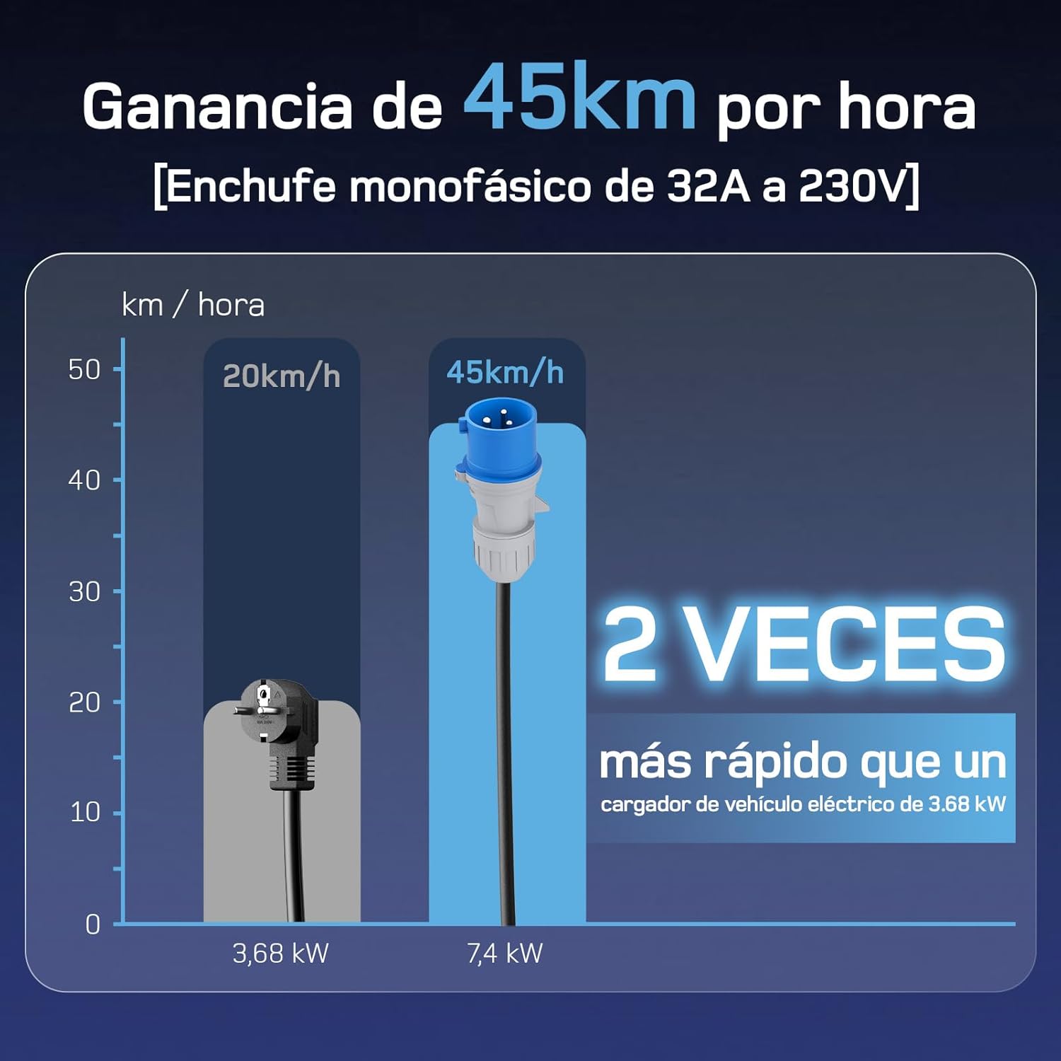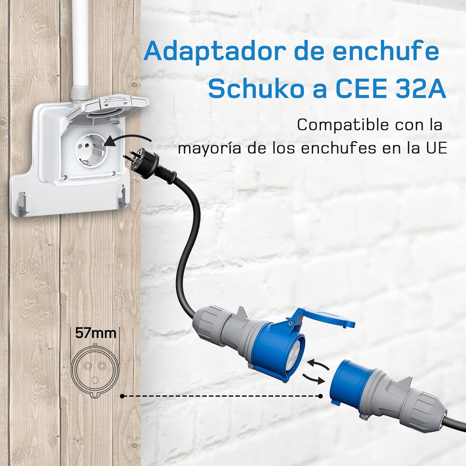 【2 veces más rápido que el original】Con el enchufe CEE 32A, obtienes una potencia de carga de 7,4kW por hora (230V x 32A). 2 veces más rápido que los enchufes Schuko domésticos habituales. Corriente conmutable 6/10/16/20/24/32A para satisfacer todas sus necesidades.